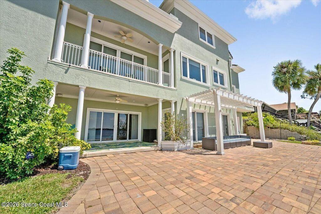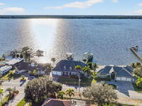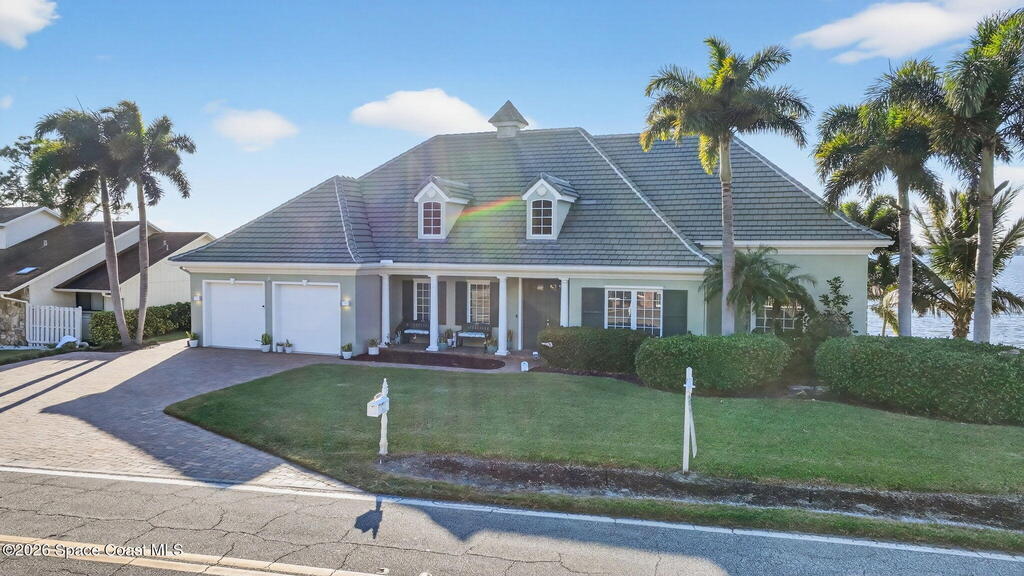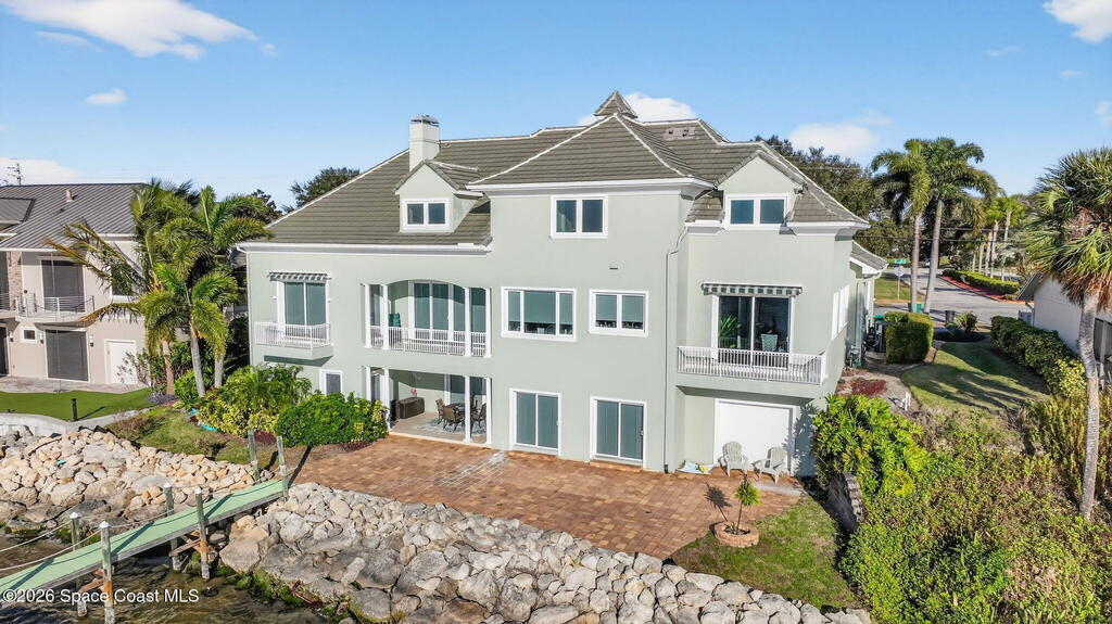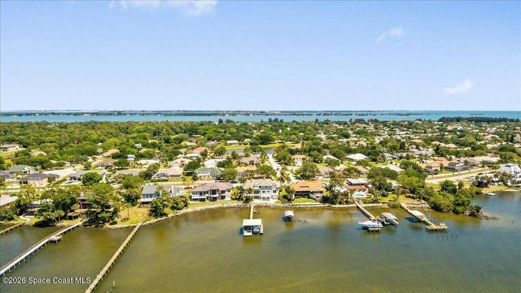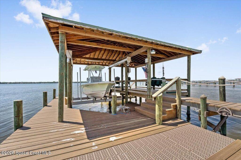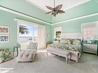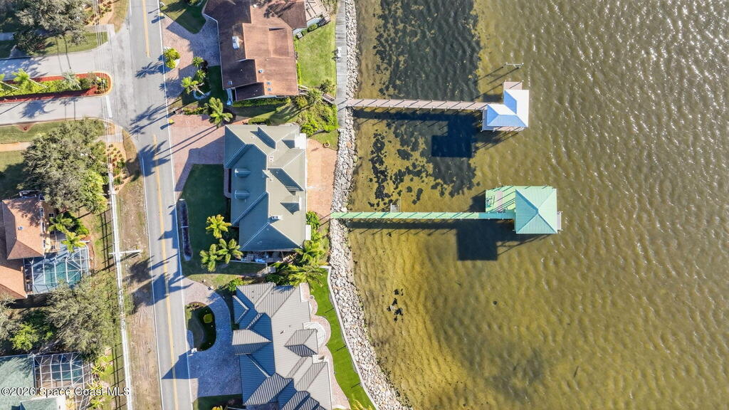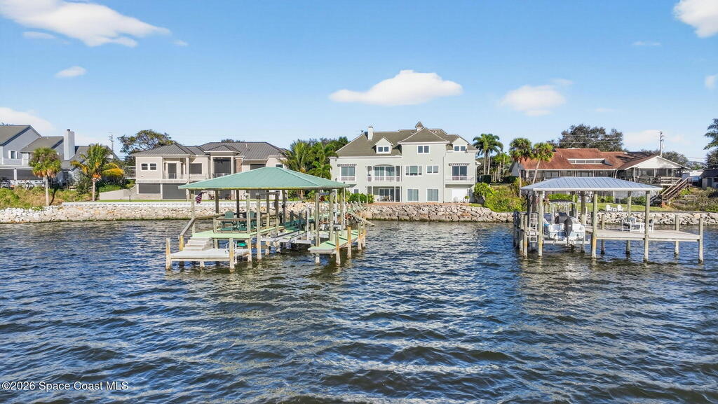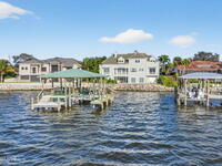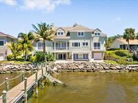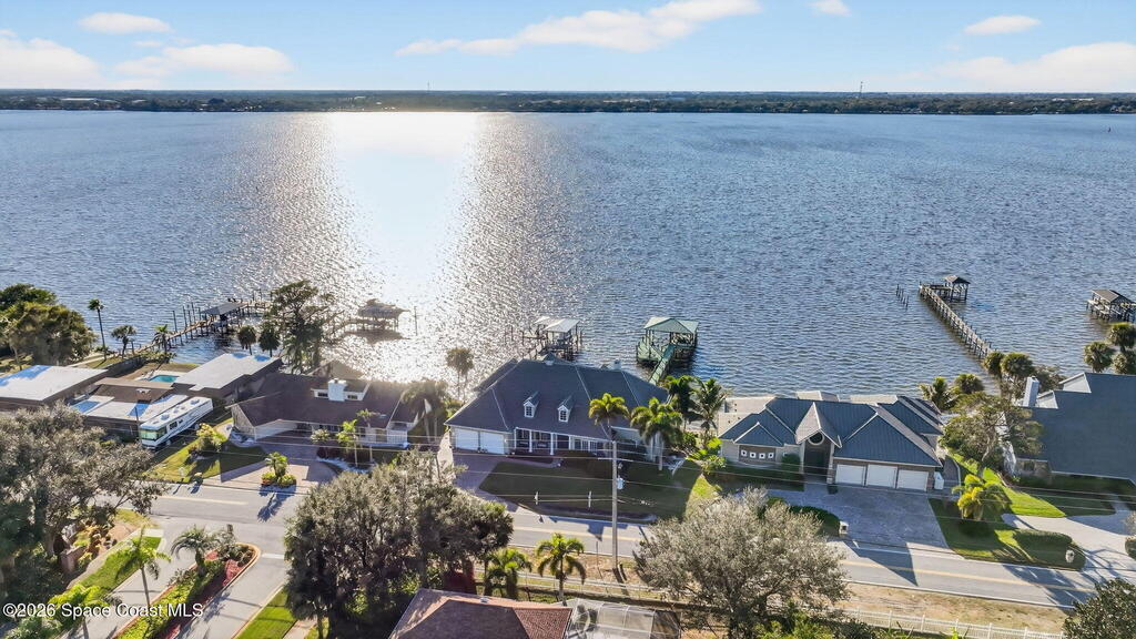 Experience expansive views of the marine-life-filled Indian River and breathtaking sunsets from every room of this 5200 sq ft waterfront home. Featuring 5 bedrooms, 6 baths, an office, and bonus room, this residence offers exceptional space for multi-generational living or entertaining. The stunning eat-in kitchen boasts river views, a balcony, custom cabinetry, granite counters, chef's island, and Sub-Zero refrigerator. The primary suite on the main level includes a private riverfront terrace. A lower-level suite offers living space, kitchenette area, and walk-out access to the river. Architectural details include tray ceilings, wood beams, crown molding, and high ceilings throughout. Enjoy the expanded dock with boat lift (2018), step-down fishing area, coquina rock shoreline, and large paved patio with fire pit. Oversized bedrooms, abundant storage, large closets, 2 NEW a/c units, no-see-um screened balcony, and jet ski lift, complete this exceptional riverfront retreat.
