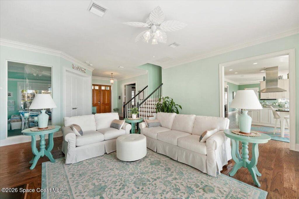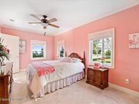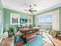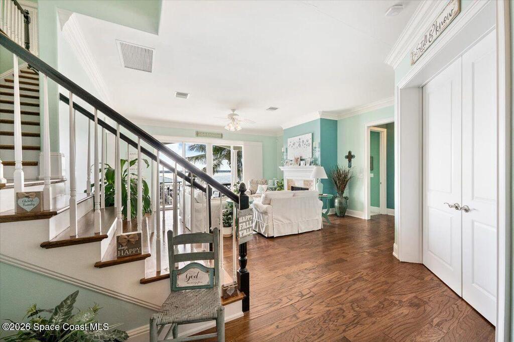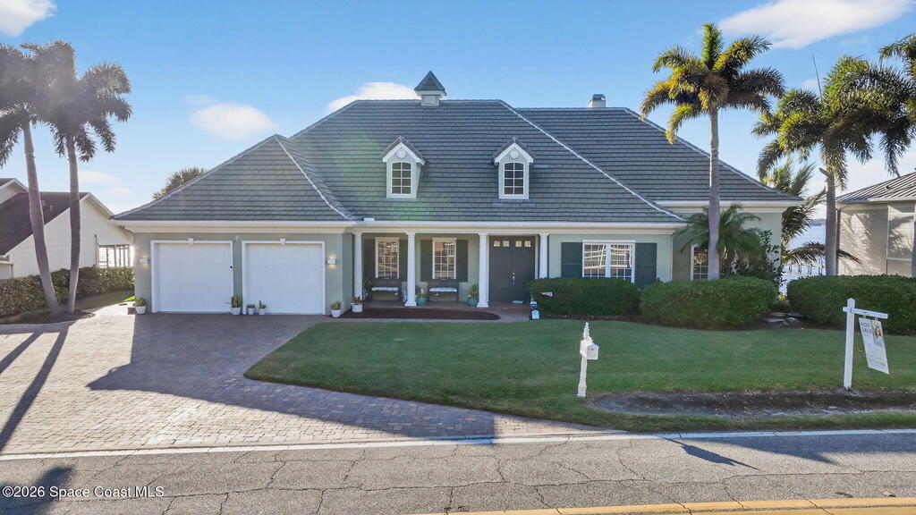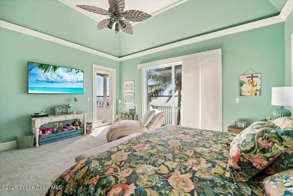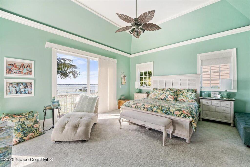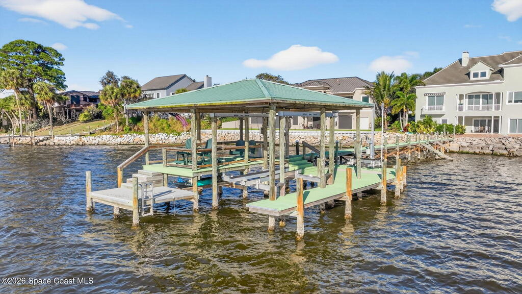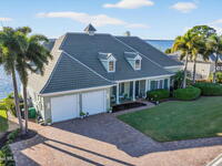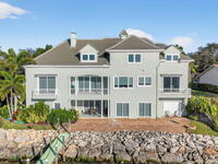 Experience expansive views of the marine-life-filled Indian River and breathtaking sunsets from every room of this 5200 sq ft waterfront home. Featuring 5 bedrooms, 6 baths, an office, and bonus room, this residence offers exceptional space for multi-generational living or entertaining. The stunning eat-in kitchen boasts river views, a balcony, custom cabinetry, granite counters, chef's island, and Sub-Zero refrigerator. The primary suite on the main level includes a private riverfront terrace. A lower-level suite offers living space, kitchenette area, and walk-out access to the river. Architectural details include tray ceilings, wood beams, crown molding, and high ceilings throughout. Enjoy the expanded dock with boat lift (2018), step-down fishing area, coquina rock shoreline, and large paved patio with fire pit. Oversized bedrooms, abundant storage, large closets, 2 NEW a/c units, no-see-um screened balcony, and jet ski lift, complete this exceptional riverfront retreat.