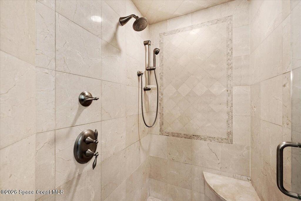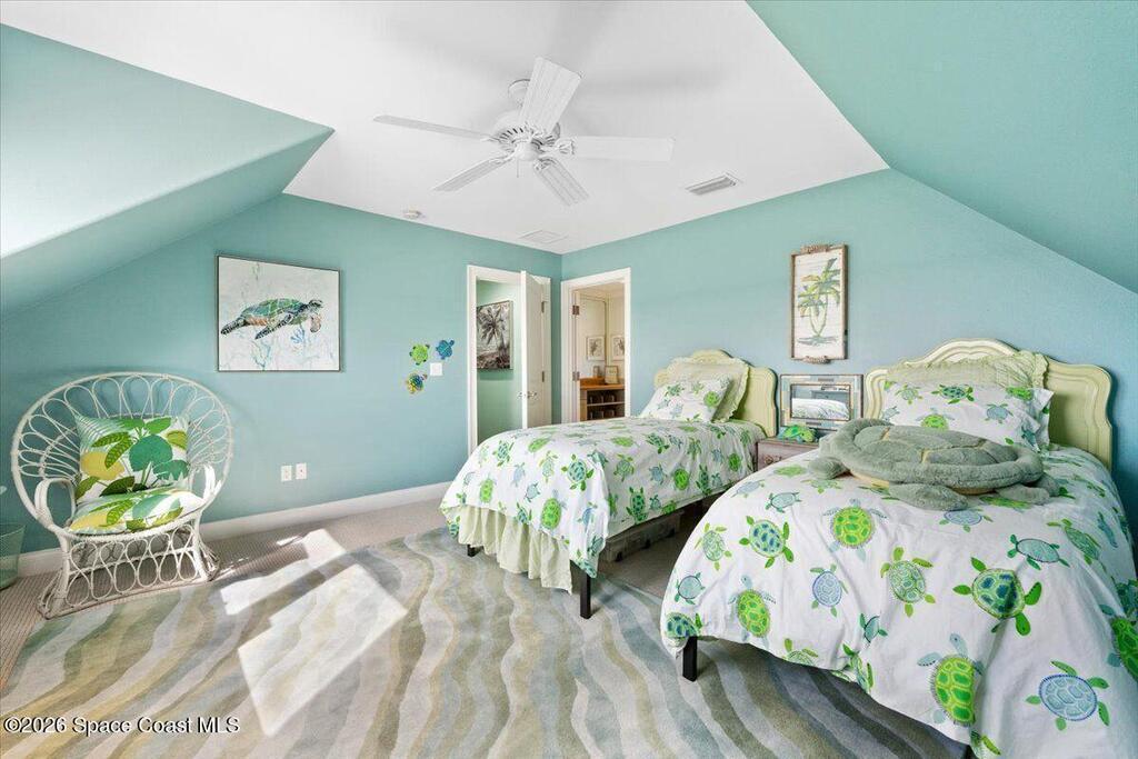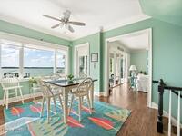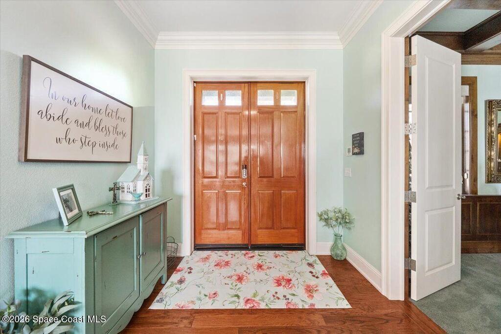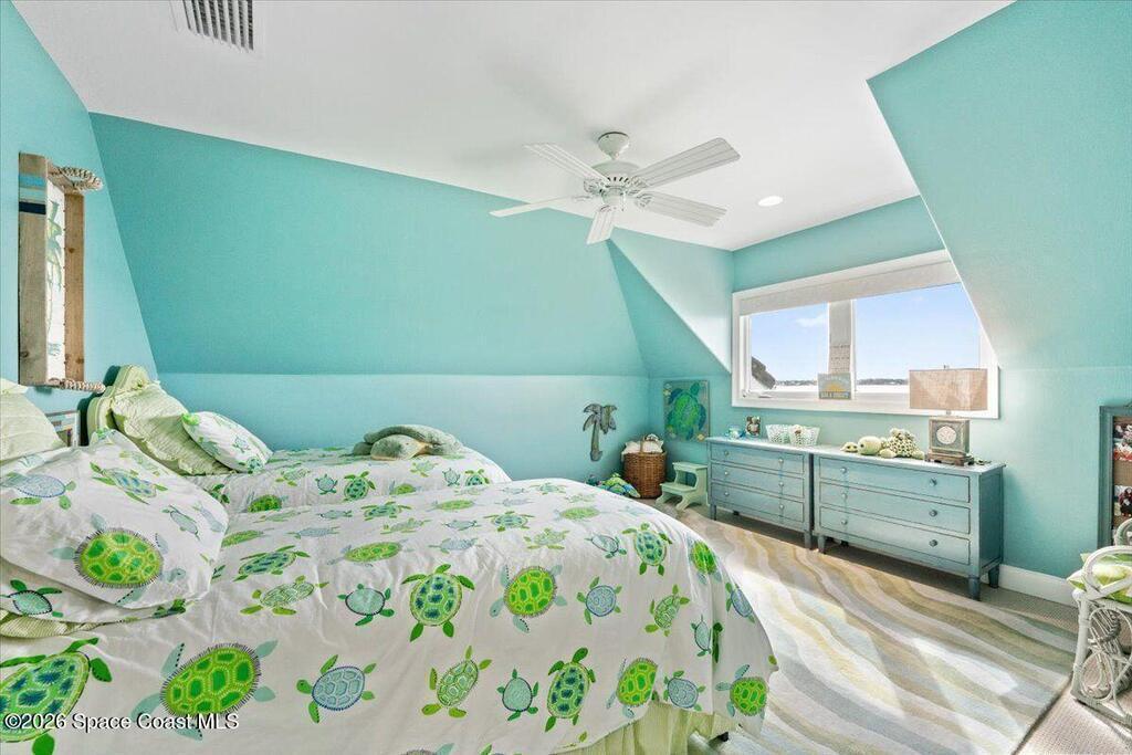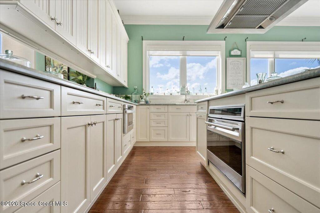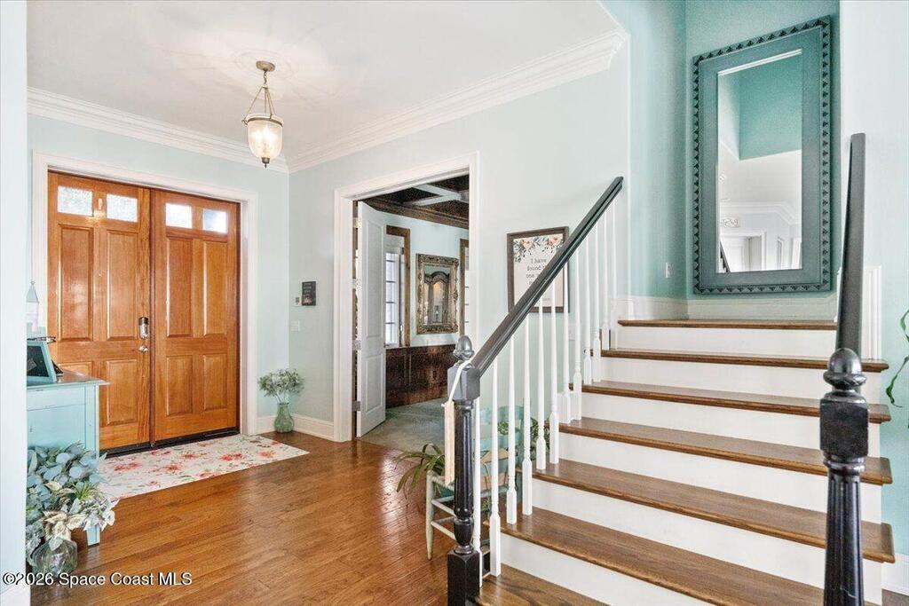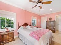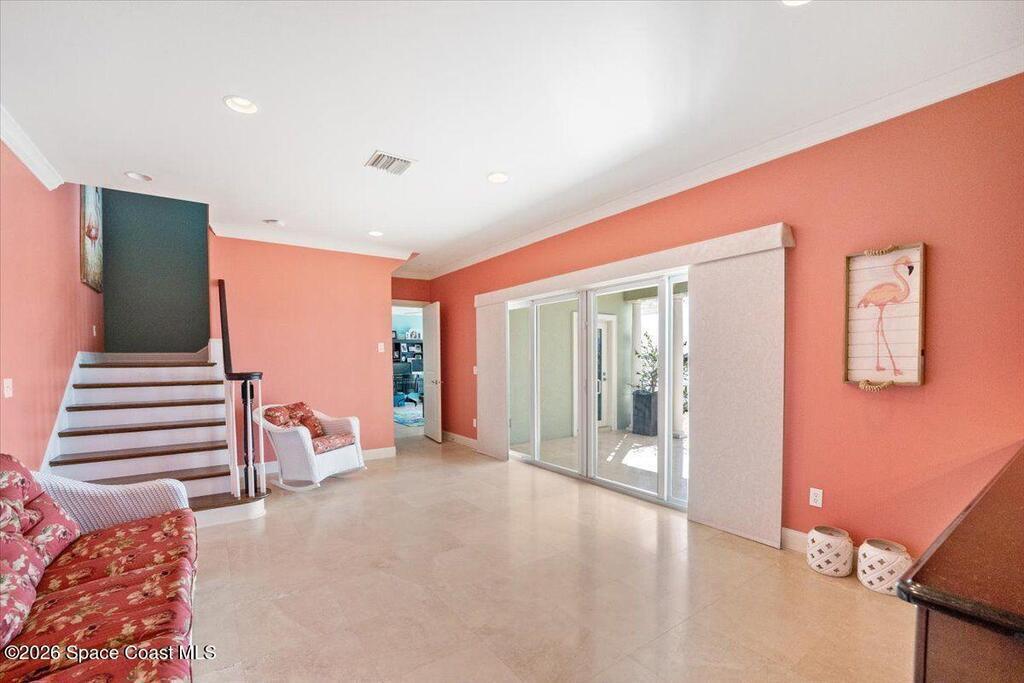 Experience expansive views of the marine-life-filled Indian River and breathtaking sunsets from every room of this 5200 sq ft waterfront home. Featuring 5 bedrooms, 6 baths, an office, and bonus room, this residence offers exceptional space for multi-generational living or entertaining. The stunning eat-in kitchen boasts river views, a balcony, custom cabinetry, granite counters, chef's island, and Sub-Zero refrigerator. The primary suite on the main level includes a private riverfront terrace. A lower-level suite offers living space, kitchenette area, and walk-out access to the river. Architectural details include tray ceilings, wood beams, crown molding, and high ceilings throughout. Enjoy the expanded dock with boat lift (2018), step-down fishing area, coquina rock shoreline, and large paved patio with fire pit. Oversized bedrooms, abundant storage, large closets, 2 NEW a/c units, no-see-um screened balcony, and jet ski lift, complete this exceptional riverfront retreat.