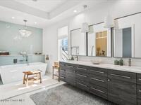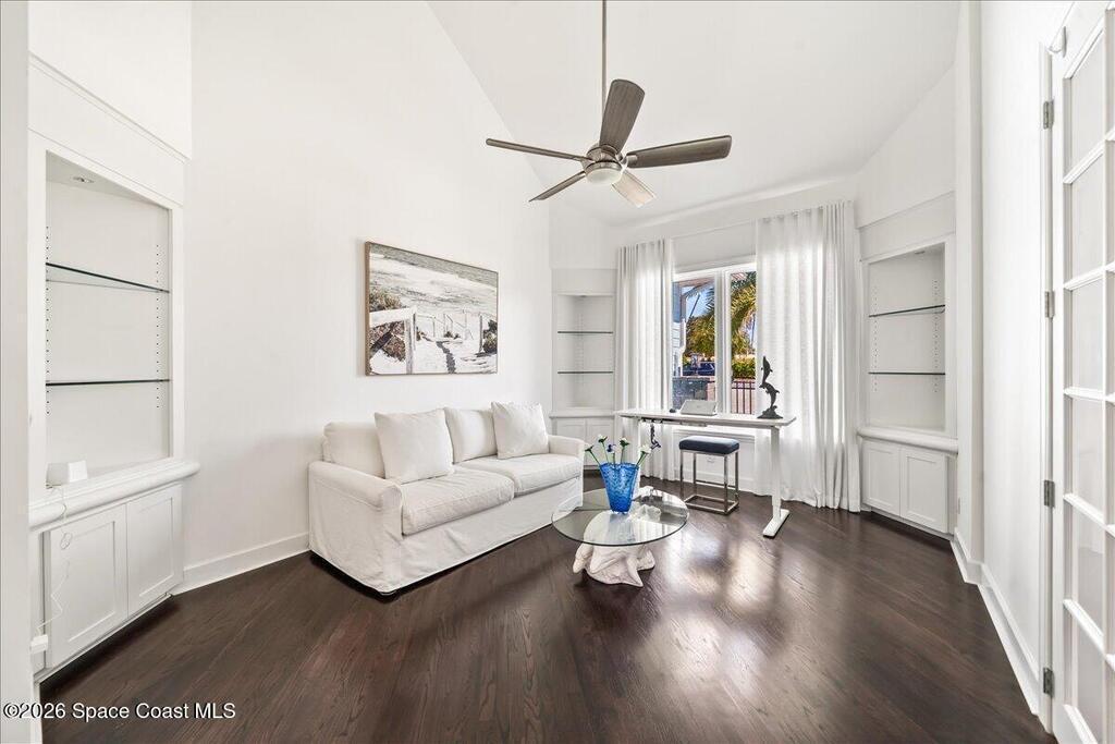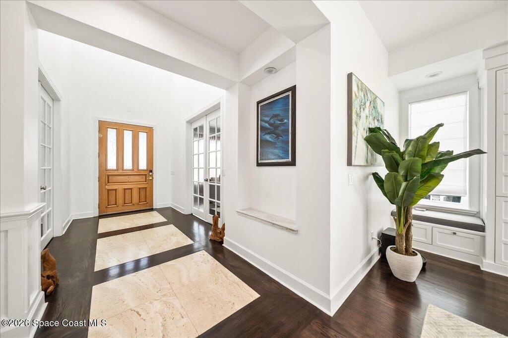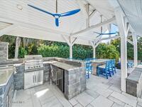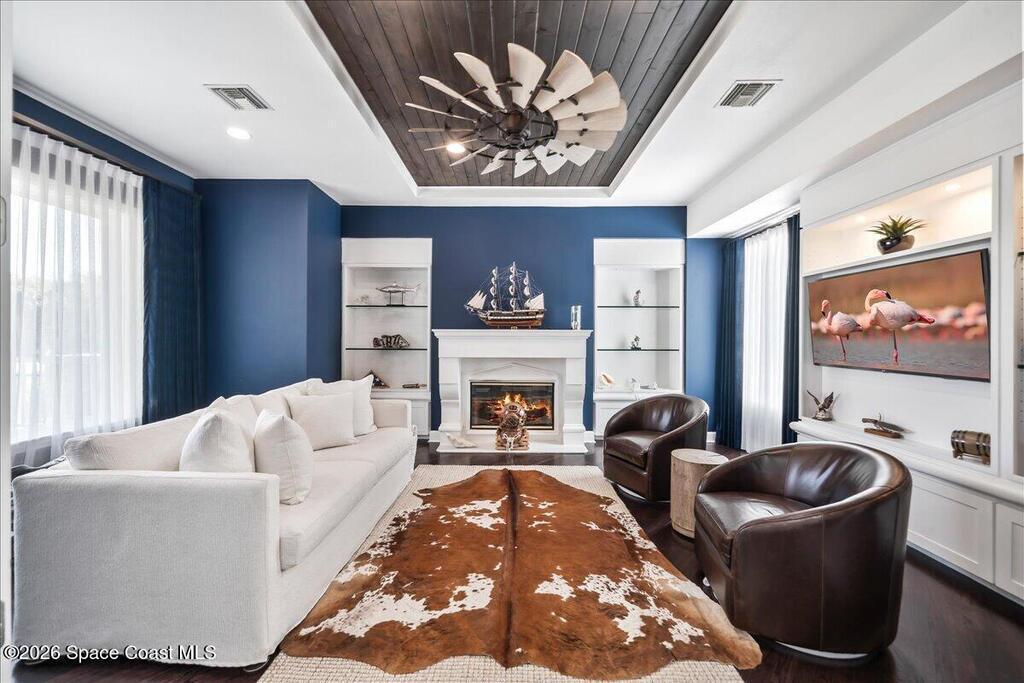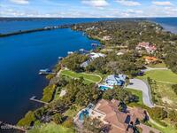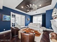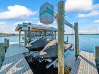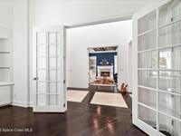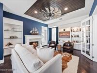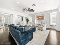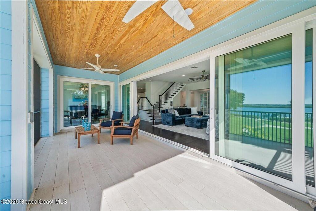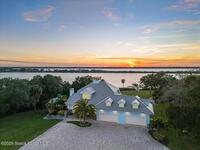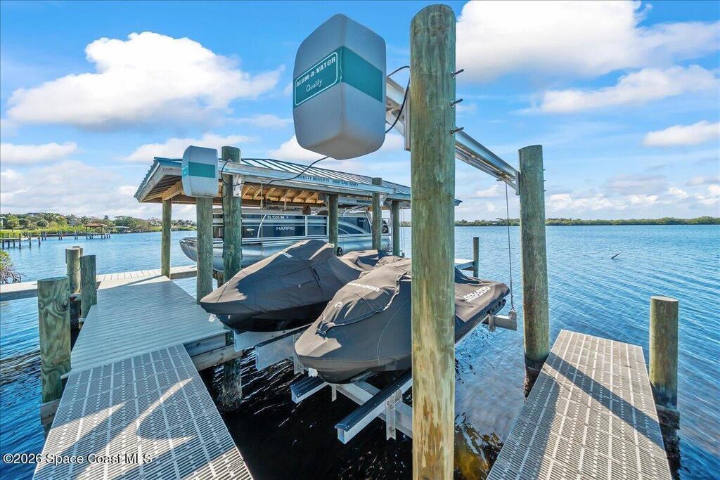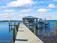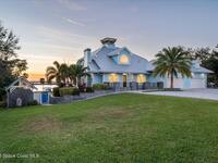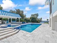 From the moment you step through the front door, you're greeted by sweeping, uninterrupted views of Honeymoon Lake, an immediate sense of arrival that sets the tone for the entire residence. Positioned along one of Brevard County's most coveted waterways, this singular waterfront estate is a study in quiet luxury and intentional design. Custom-stained oak hardwood floors, layered textures, and a gas fireplace create interiors that feel both polished and inviting, while the home's thoughtful layout draws the eye effortlessly toward the water beyond. Designed for seamless indoor-outdoor living, the exterior unfolds into a resort-style setting where a marble-framed pool, summer kitchen, and expansive pavered terraces invite long afternoons and elegant evenings. A powered dock with dual boat lifts provides direct access to the water, complemented by a Trex deck ideal for sunrise departures and sunset returns. Built with resilience and longevity in mind, the home features a metal roof,