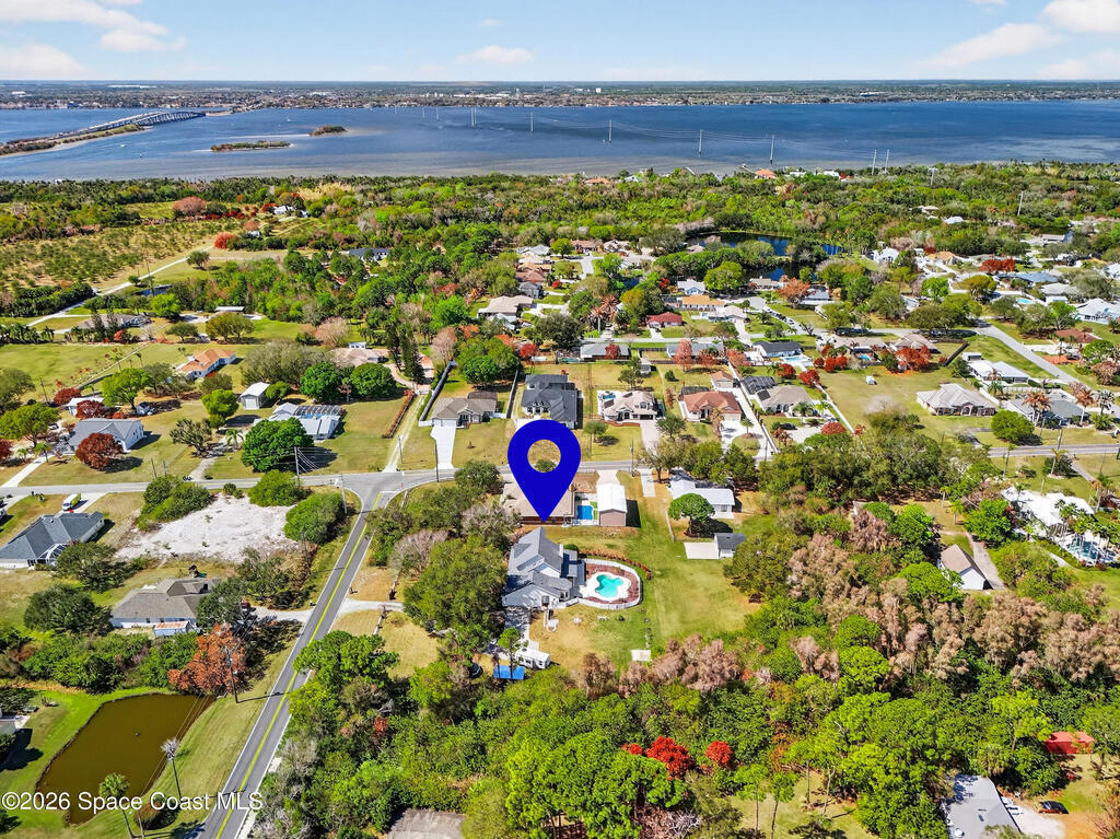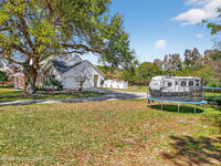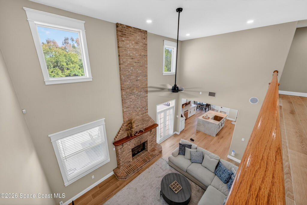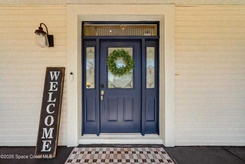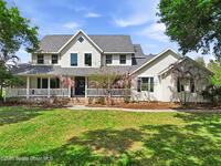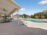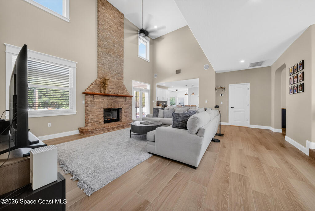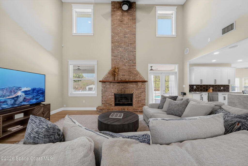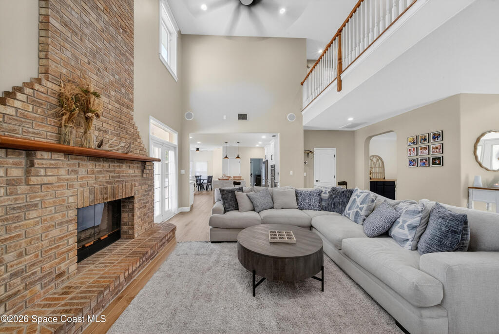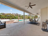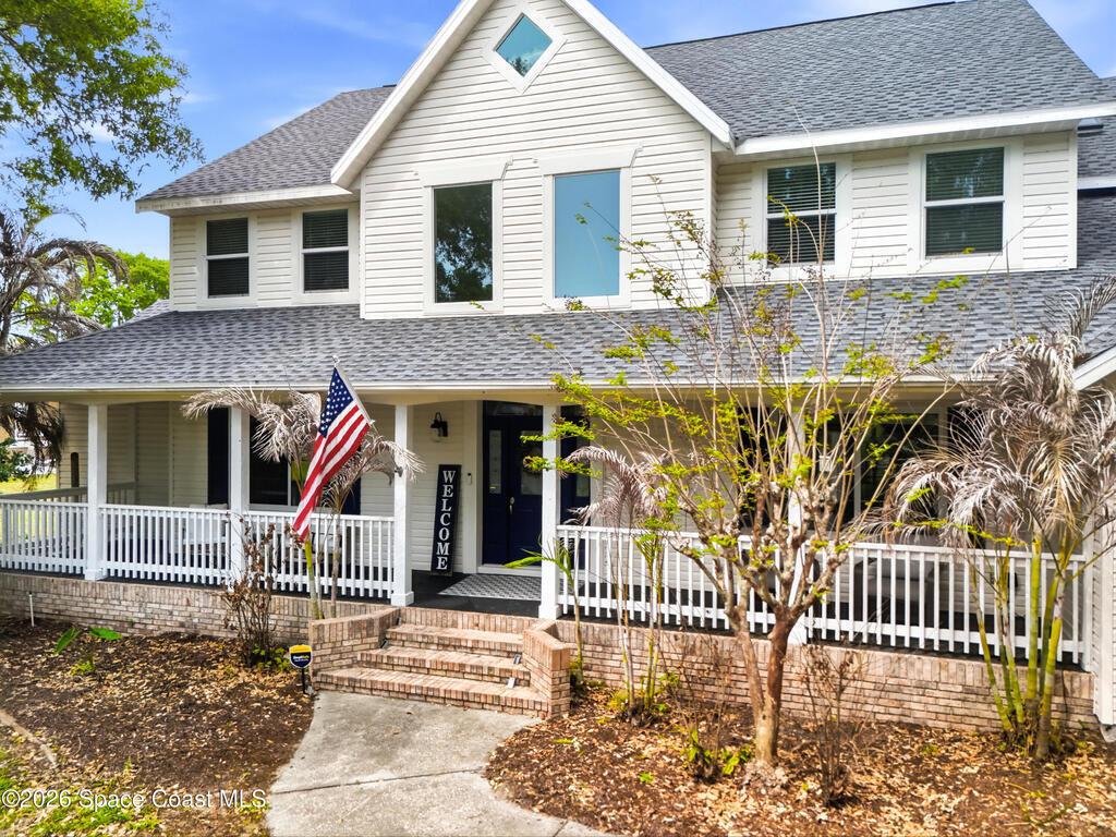 New roof installed June 2025 and Category 5 hurricane windows already in place; providing immediate value and peace of mind in this spacious Merritt Island acreage property.Situated on a full acre, this 5-bedroom, 3.5-bath home offers a welcoming presence from the covered front porch to the grand foyer entry and open layout beyond. The remodeled kitchen features a stunning waterfall island, upgraded appliances, and a design that flows seamlessly into the main living areas; ideal for gathering and everyday living.Tile flooring runs through the primary spaces, complemented by a charming brick fireplace that adds warmth and character. The primary suite is conveniently located on the first floor, offering privacy and flexibility within the home's thoughtful layout.Step outside to the covered back porch overlooking the pool and expansive backyard; perfect for outdoor dining, relaxing, or enjoying the surrounding green space.