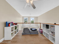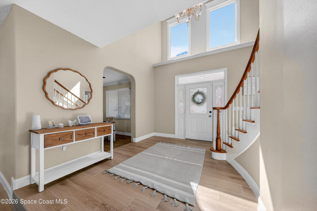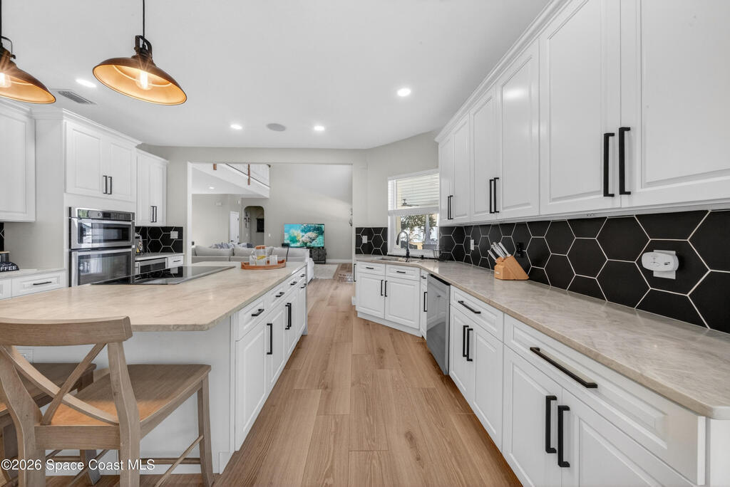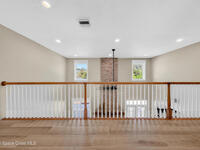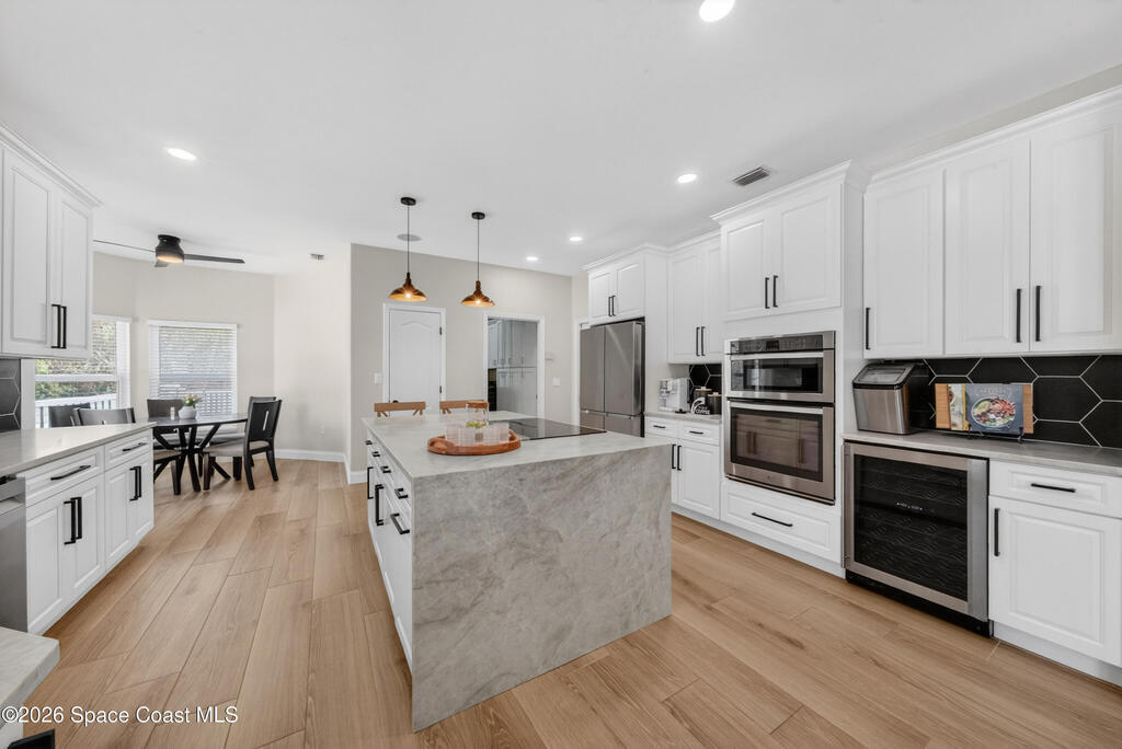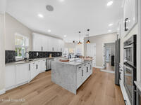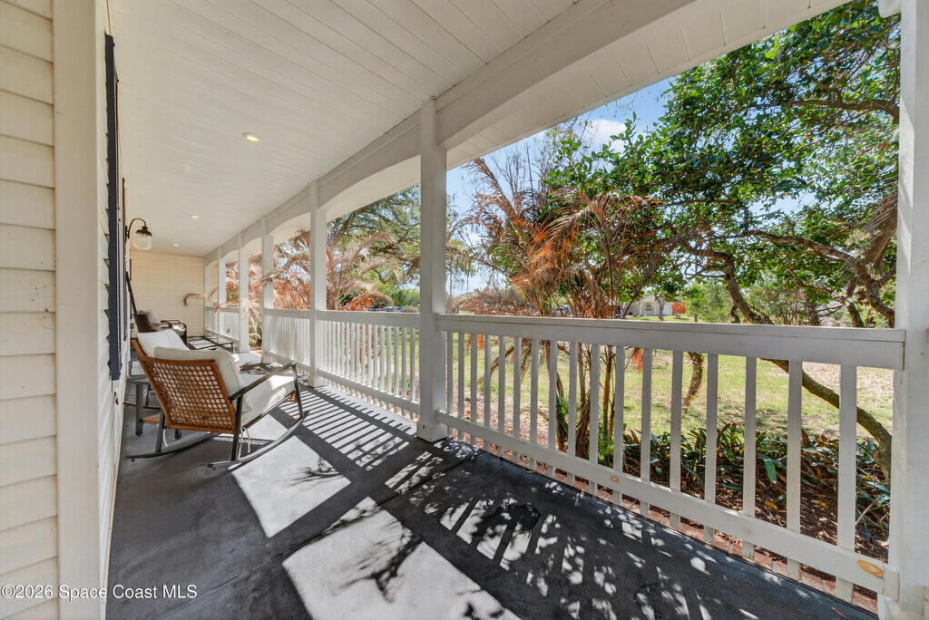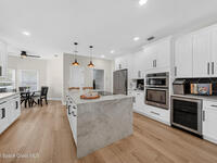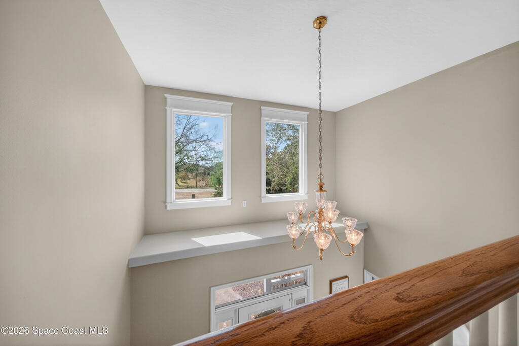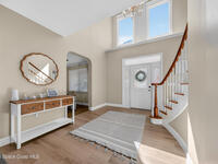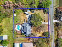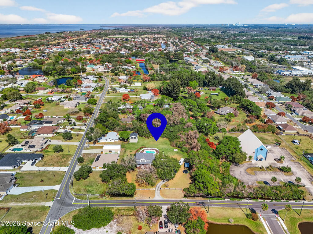 New roof installed June 2025 and Category 5 hurricane windows already in place; providing immediate value and peace of mind in this spacious Merritt Island acreage property.Situated on a full acre, this 5-bedroom, 3.5-bath home offers a welcoming presence from the covered front porch to the grand foyer entry and open layout beyond. The remodeled kitchen features a stunning waterfall island, upgraded appliances, and a design that flows seamlessly into the main living areas; ideal for gathering and everyday living.Tile flooring runs through the primary spaces, complemented by a charming brick fireplace that adds warmth and character. The primary suite is conveniently located on the first floor, offering privacy and flexibility within the home's thoughtful layout.Step outside to the covered back porch overlooking the pool and expansive backyard; perfect for outdoor dining, relaxing, or enjoying the surrounding green space.