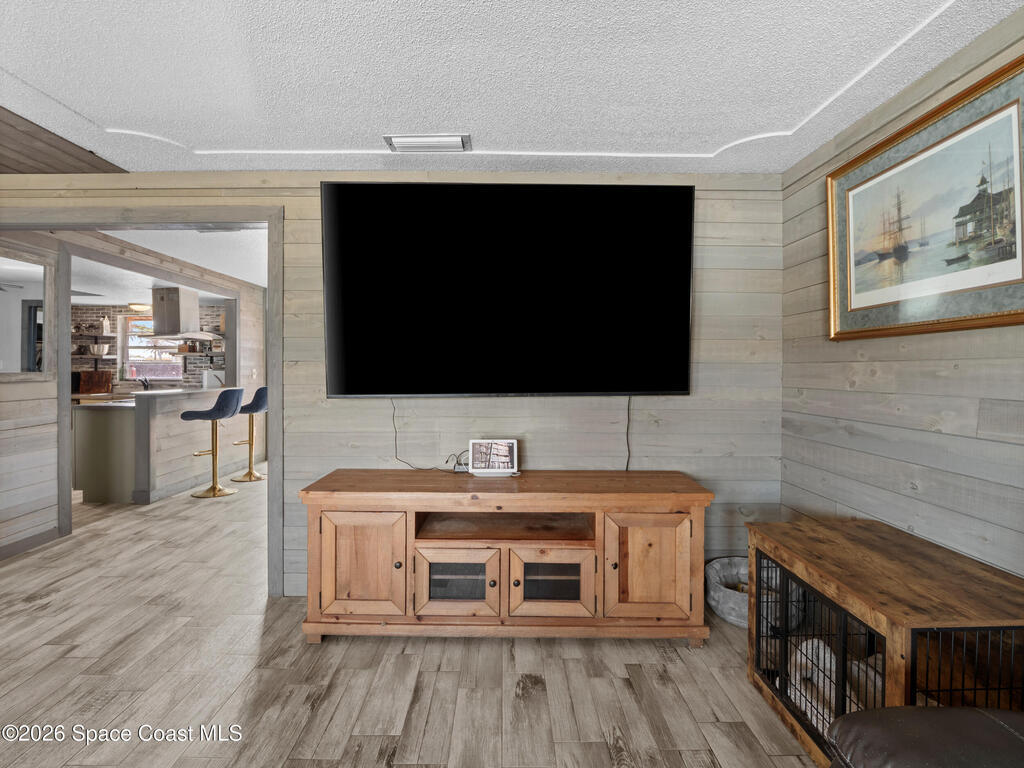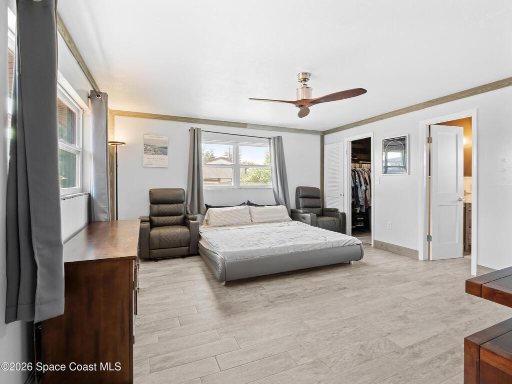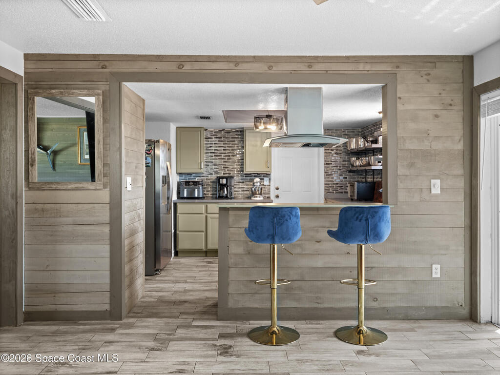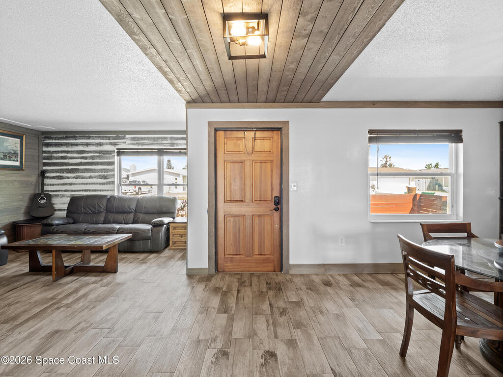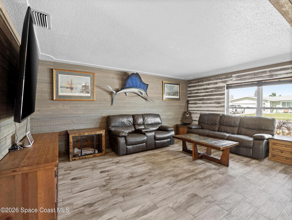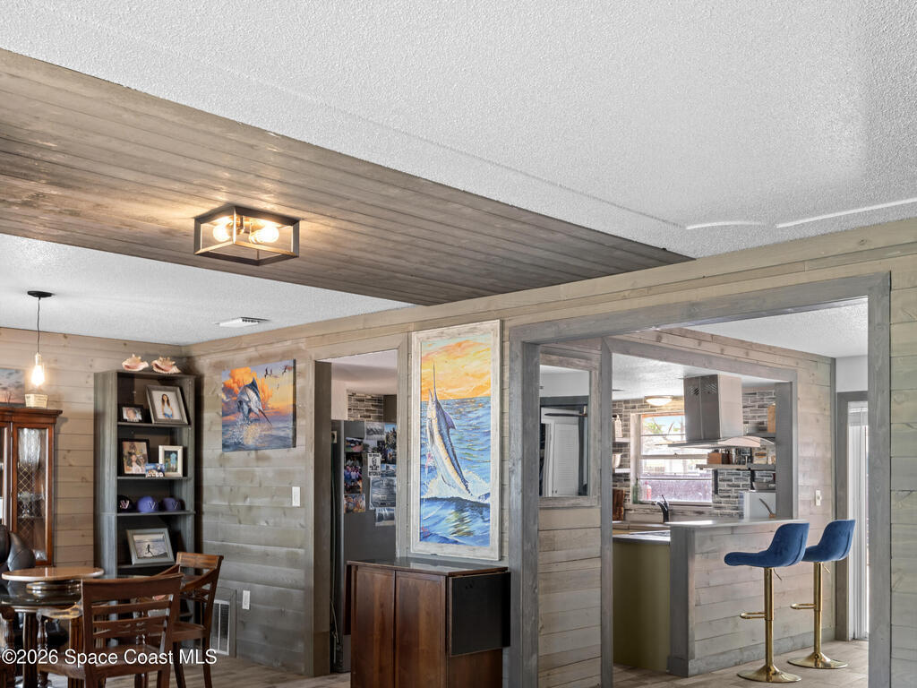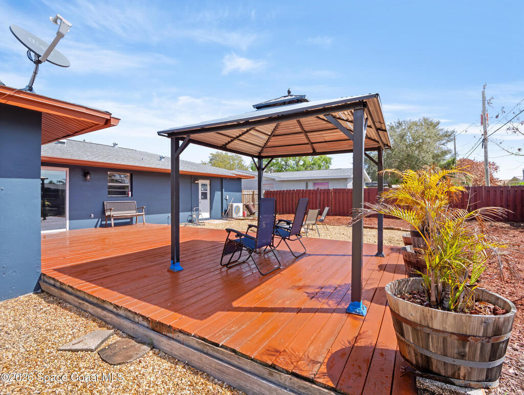 Welcome to this beautifully updated Merritt Island home offering 3 bedrooms, 2 baths, and inviting indoor-outdoor living. A private front courtyard creates a welcoming entry and the perfect space for relaxing or entertaining. Inside, the home features an open and comfortable layout with wood-look flooring, warm wood accents, and abundant natural light throughout. The kitchen offers stainless appliances and flows easily into the dining and living areas, making everyday living effortless. The split bedroom design provides privacy for the primary suite while keeping guest rooms conveniently located. Recent improvements include a newer roof, updated systems, and fresh exterior paint that adds standout curb appeal. The spacious yard offers room to garden, play, or create your own outdoor retreat. Ideally located near the Banana River, parks, shopping, dining, and just a short drive to Cocoa Beach and Port Canaveral, this home offers the best of Merritt Island living.