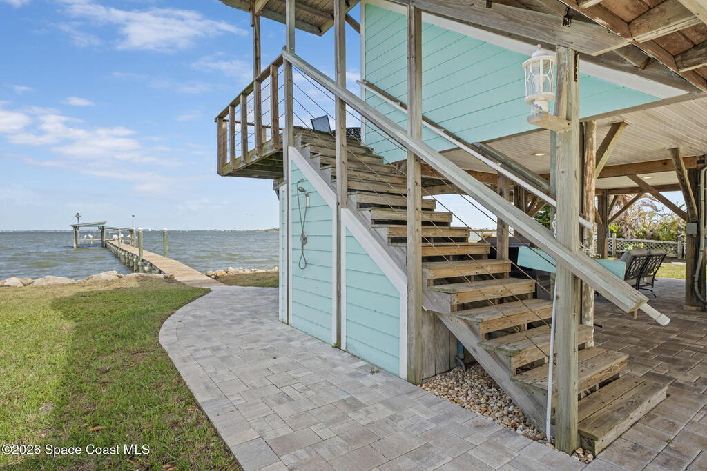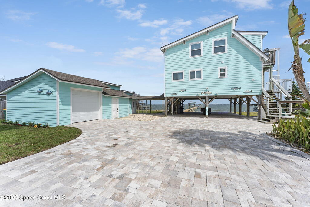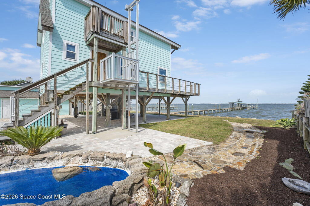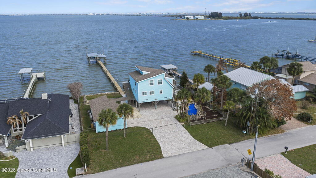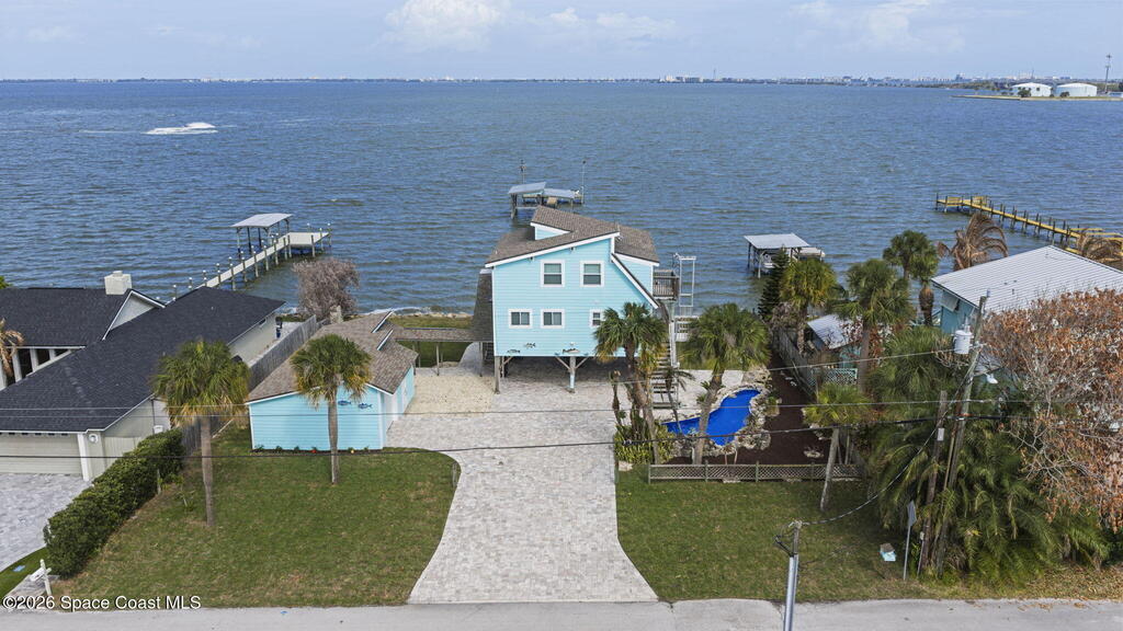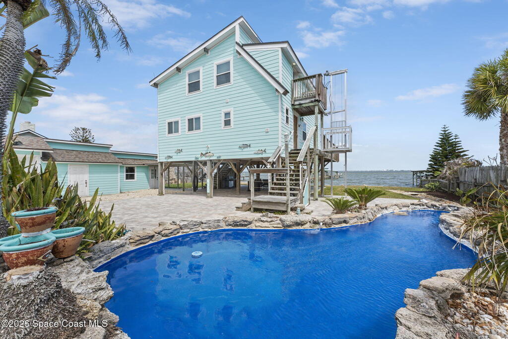 If Florida had a home, this would be it. Completely renovated, this elevated stilt home sits directly on the Banana River with wide open water views and direct access to Port Canaveral. Enjoy everything the Space Coast has to offer, from dolphins and manatees in your backyard to rocket launches overhead. A private dock with boat lift makes getting out on the water a breeze. Inside, the home offers 3 bedrooms, 2 full baths, and 2 half baths with an open layout centered around a chef's kitchen featuring quartz countertops and stainless steel appliances, flowing into the main living and dining areas with the river views front and center. The primary suite includes a private balcony overlooking the water. Outside, enjoy a pool, stone fireplace, and a paver driveway set within a well maintained yard. A detached air conditioned flex space with river views offers options for an office, studio, or additional living area. Well updated and positioned for true waterfront living.