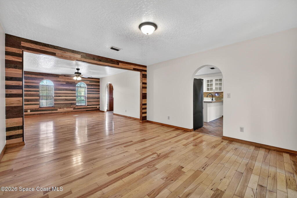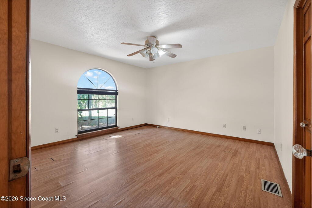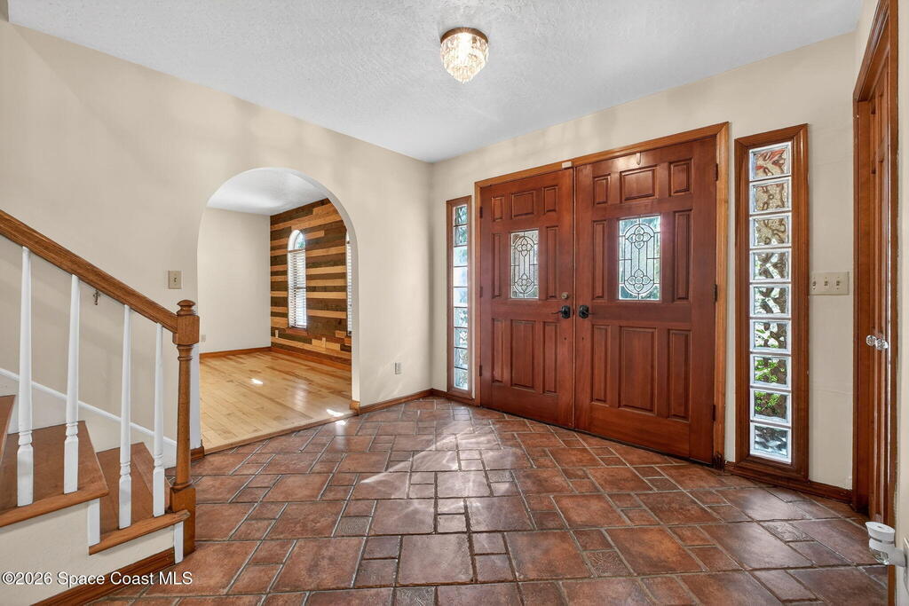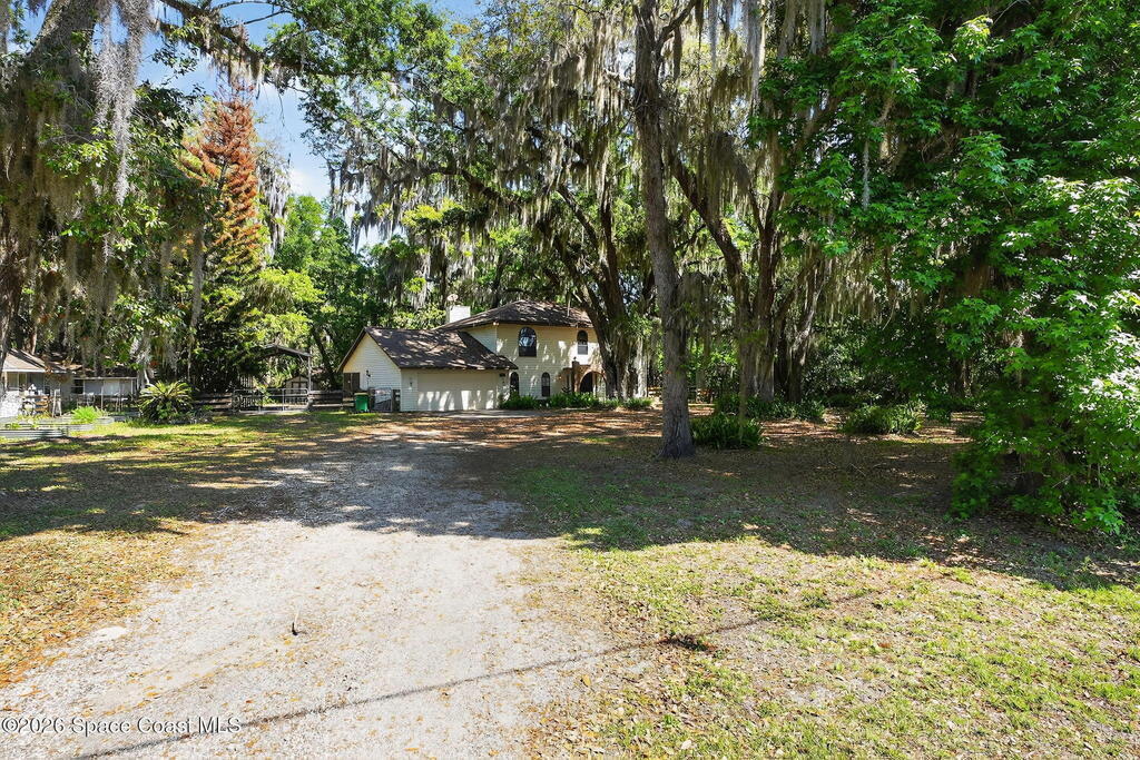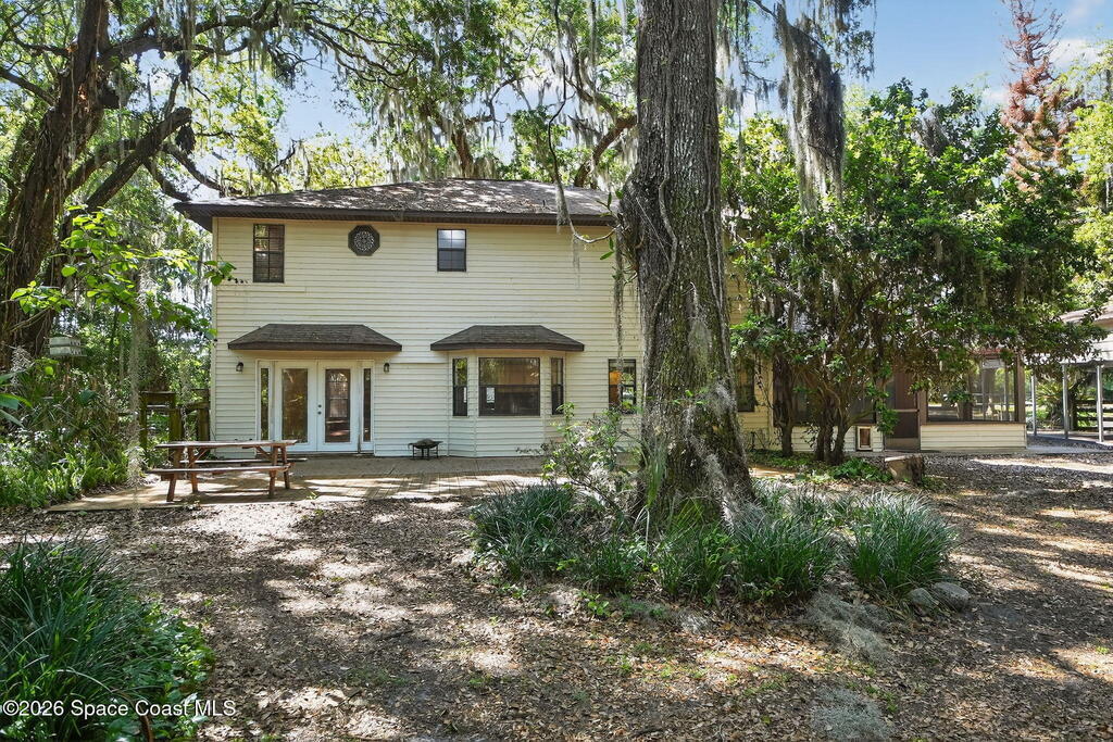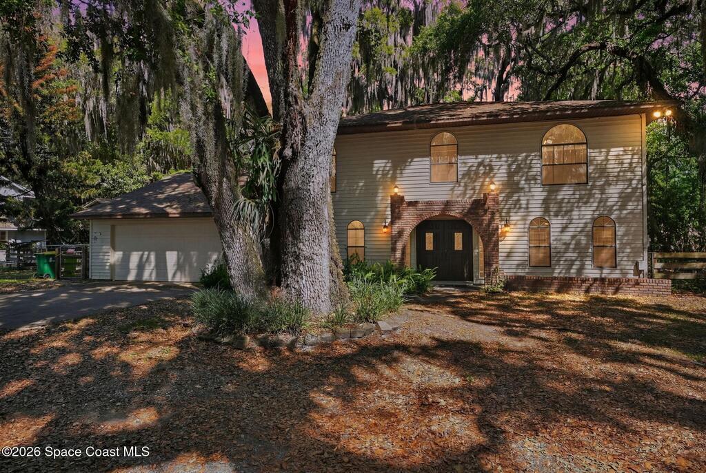 The expansive 2, 574 sq. ft. interior features a formal living and dining area highlighted by a cozy wood-burning fireplace. The updated kitchen is a culinary dream, boasting solid wood cabinetry, high-end stainless steel appliances, a large pantry, and a convenient breakfast nook that overlooks the lush backyard. Retreat upstairs to find a generous master suite featuring a massive bathroom with a separate tub and shower. Step out onto the covered patio or host guests on the massive rear deck overlooking a serene landscape of oaks and exotic foliage. Enjoy peaceful afternoons by the pond or relax in the private gazebo. The property also includes a 2-car attached garage and plenty of space for your boat or RV. Located just east of US-1, you are only 10 minutes from Downtown Titusville and close to local boat ramps for premier fishing.