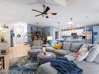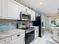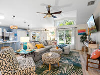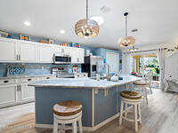 Situated on a premium cul-de-sac lot with sparkling lake views, this charming, lovingly maintained home has been thoughtfully transformed ~ in the coveted Auburn Estates neighborhood. Its great curb appeal shines with fresh tropical landscaping, neat and tidy planting beds edged with curbing, and a clean river-rock finish. Inside, a modern, truly open floorplan welcomes you with vaulted ceilings, abundant natural light, beautiful transom windows, and solar tubes that brighten every corner. The spacious dining and great rooms flow seamlessly into the kitchen, where crisp white updated cabinets are topped with gorgeous granite, complemented by a subway tile backsplash, stainless appliances, a massive pantry, and a huge counter-height island perfect for gathering. Step through the sliding glass doors to a tiled under-truss porch where tranquil lake views offer daily serenity. The owner's suite feels like a retreat with its completely updated ensuite - featuring a new double-sink vanity,