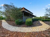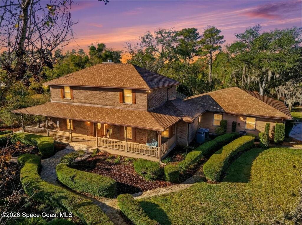 Serene, private 2 story brick (NC Farmhouse style) home with wrap around front porch situated on 1 acre lot. This pool home features 4 bedrooms (3 up, 1 down), 3.5 baths and a 575 sqft bonus room with office. On the main floor is a bedroom and bath, dedicated dining room, kitchen, and half bath along with a living room with fireplace, interior utility/laundry room with adjoining large walk-in pantry. Kitchen has 42'' cabinets with quartz counter top with eat in dining area with built in bench. Upstairs you'll find the primary suite & 2 additional bedrooms as well as a full bathroom. The large primary suite features dual walk in closets and private bathroom. Enjoy your morning coffee listening to the birds on the front porch or out back in your private oasis with a screened in 12X30 pool with lanai that runs the whole width of the home. The fully fenced private yard has a flagstone patio with fire pit, irrigation system with well water, and 2 sheds for additional storage.