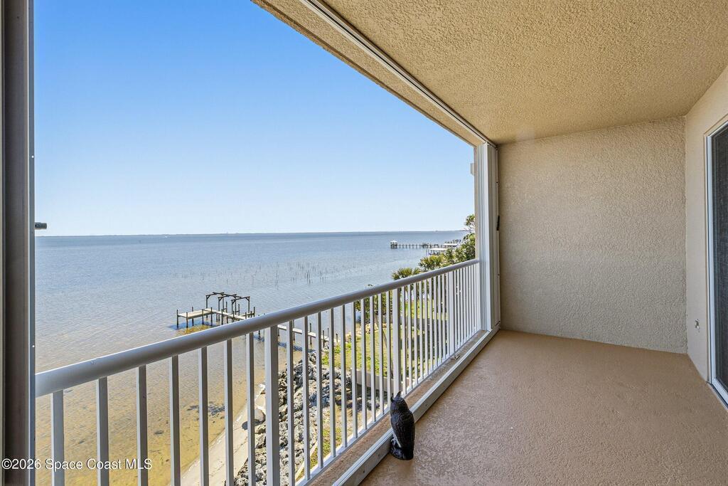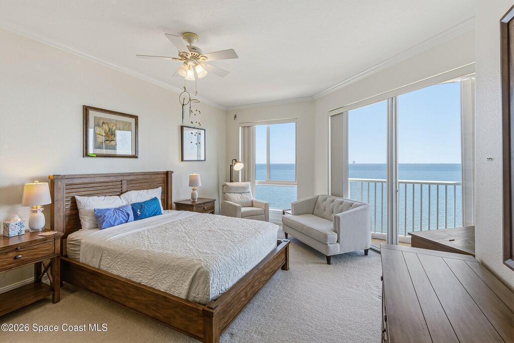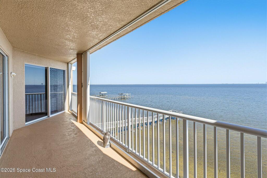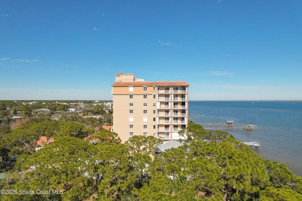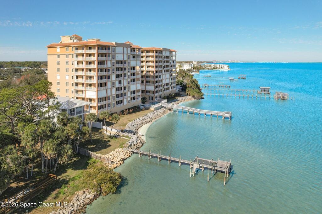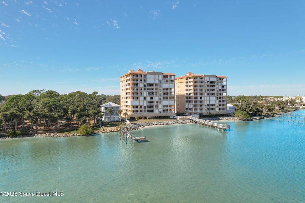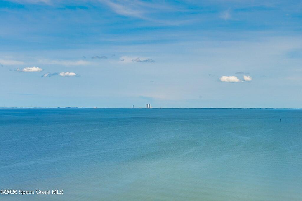 The most sought after direct Indian River views from this gorgeous 4th floor unit. Enjoy views of the Space Center and rocket launches, river wildlife and spectacular sunrises. 3 spacious bedrooms- main bedroom with slider to balcony for private enjoyment. His & her closets, large main bathroom with double vanity, garden tub and separate shower. Large kitchen with appliances all new in 2021. Eat in area off the kitchen. Dining room and great room both with views of the river. Unit also offers small sitting room/office. Water heater replaced in 2019, AC in 2024 and washer/dryer 2023. Beautifully maintained complex offers pool, underground parking and up to date security.