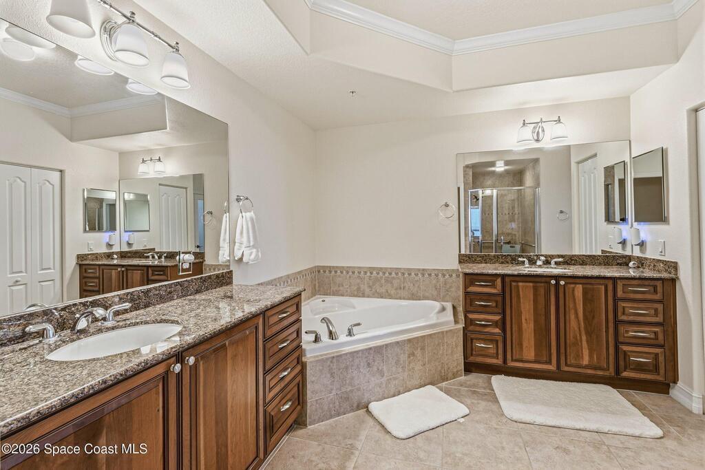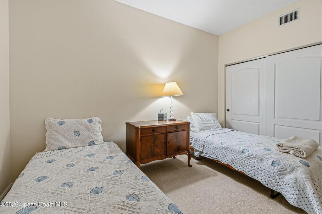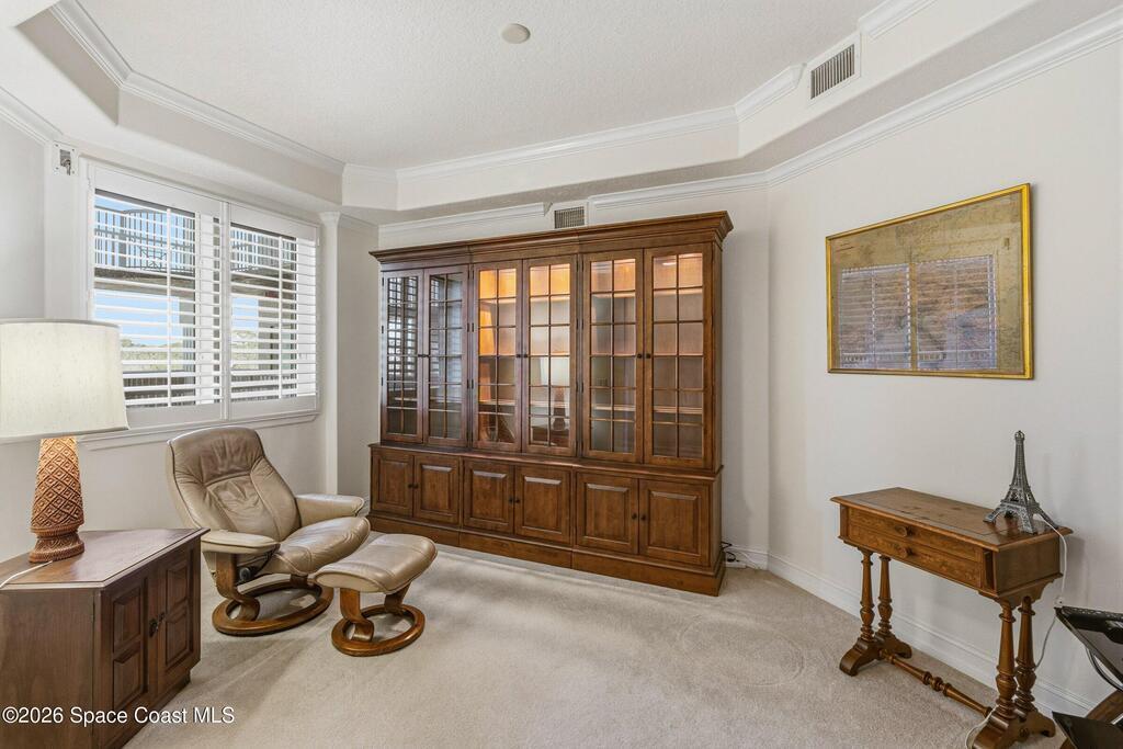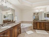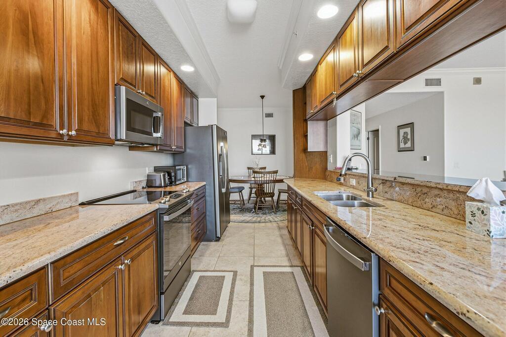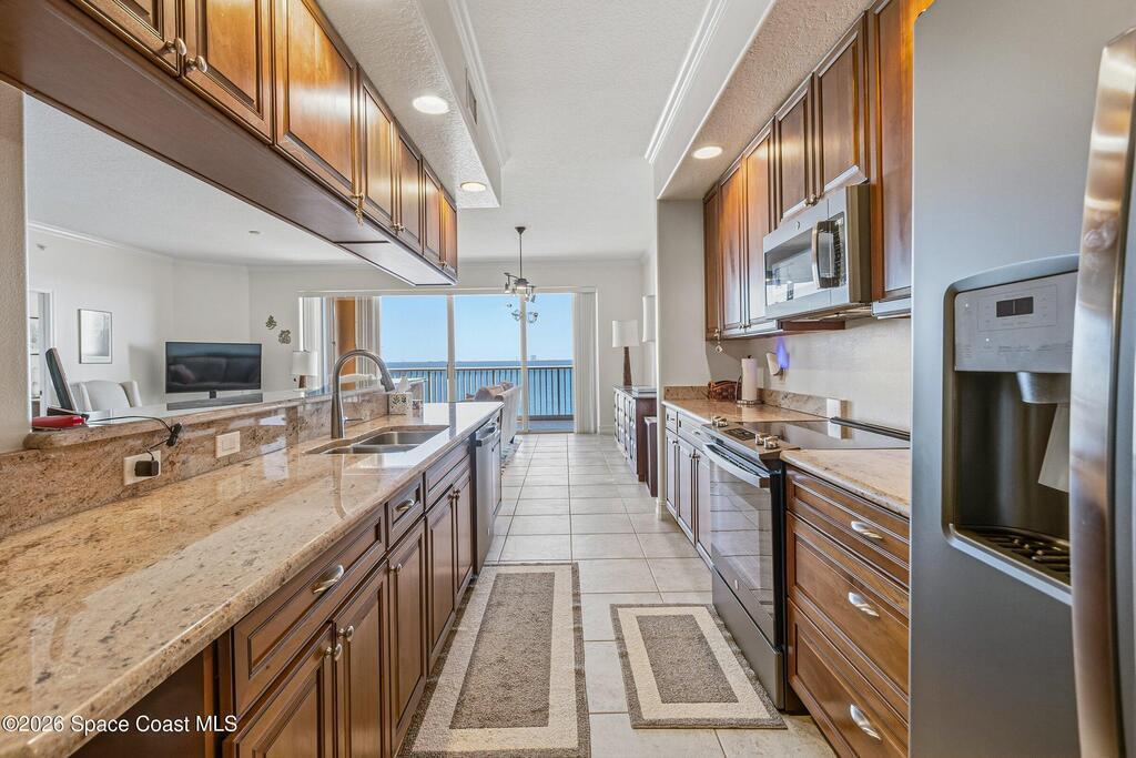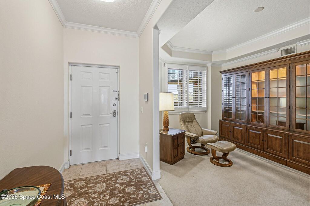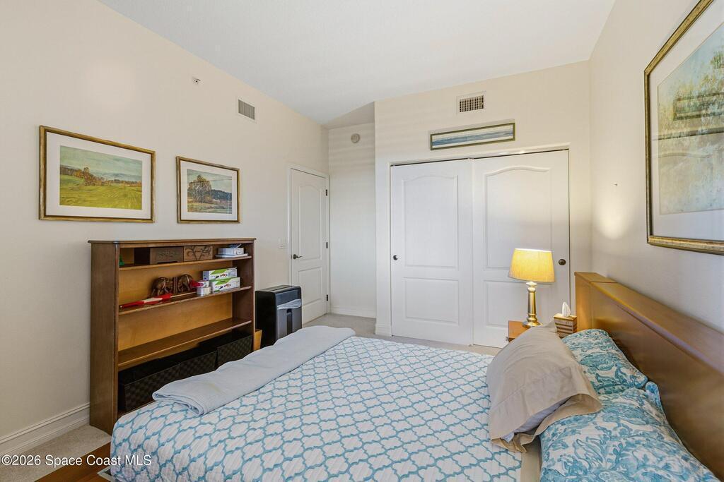 The most sought after direct Indian River views from this gorgeous 4th floor unit. Enjoy views of the Space Center and rocket launches, river wildlife and spectacular sunrises. 3 spacious bedrooms- main bedroom with slider to balcony for private enjoyment. His & her closets, large main bathroom with double vanity, garden tub and separate shower. Large kitchen with appliances all new in 2021. Eat in area off the kitchen. Dining room and great room both with views of the river. Unit also offers small sitting room/office. Water heater replaced in 2019, AC in 2024 and washer/dryer 2023. Beautifully maintained complex offers pool, underground parking and up to date security.