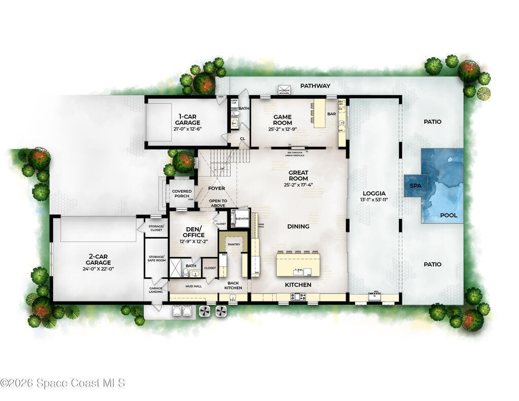 Located in the Shores at Tranquility, this to-be-built custom estate offers 3947 square feet of living space in one of Titusville's most desirable new communities. The thoughtfully designed 4-bedroom, 3.5-bath residence blends modern architecture with high-performance construction.Built with full insulated concrete form (ICF) construction on all floors, an engineered slab, wind-rated roof system, and impact-rated windows and doors, this home delivers strength, comfort, and durability. Interior features include level-5 drywall finishes, solid-core doors, oversized trim, custom cabinetry, and architectural detailing. Open living areas flow to covered outdoor spaces.Additional highlights include zoned Daikin HVAC, open-cell spray foam insulation, tankless gas water heater, whole-home generator, 400-amp electrical service pool, paver entry and lanai, and integrated security. Minutes from beaches, boating, and rocket launches on Space Coast!!