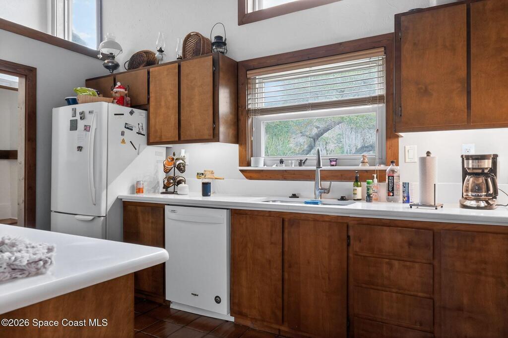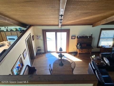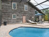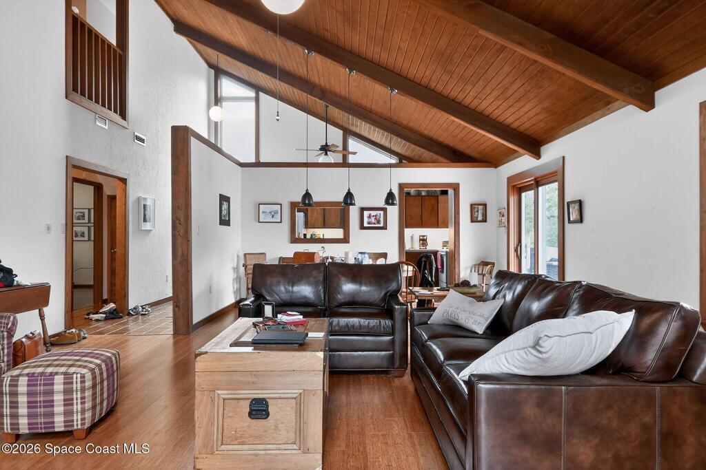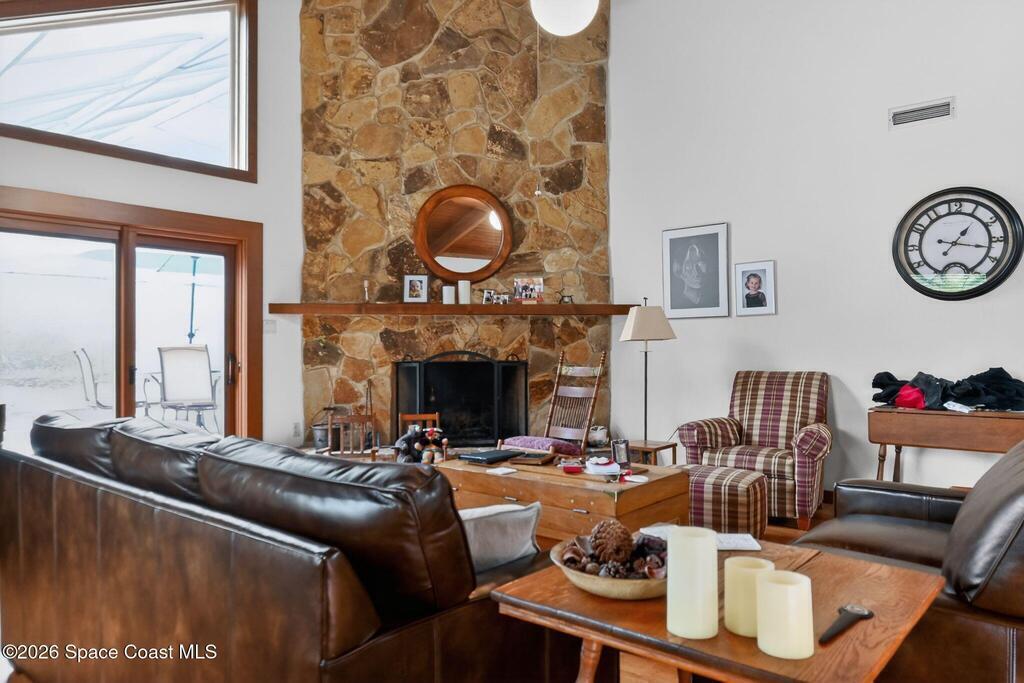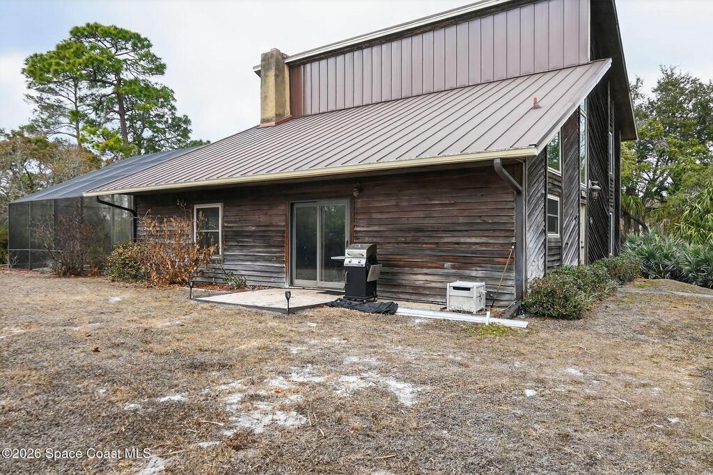 This custom built 4 bedroom/3 bath home offers 2, 080 sq ft. Situated on a spacious 1.03-acre lot, just minutes from Kennedy Space Center. Inside, soaring ceilings, wood flooring, and a striking fireplace with a marble accent wall create a warm, inviting living space. The kitchen features abundant cabinetry and flows seamlessly into the main living areas, ideal for everyday living and entertaining. Bedrooms include custom built-ins, while a versatile lower-level den is currently used as an additional bedroom.Enjoy outdoor living with a screen-enclosed pool, generous yard space, and a private setting on paved roads. Additional features include a 2 car garage, detached storage building, and a metal roof under 10 years old. A unique property offering space, character, and a prime location.
