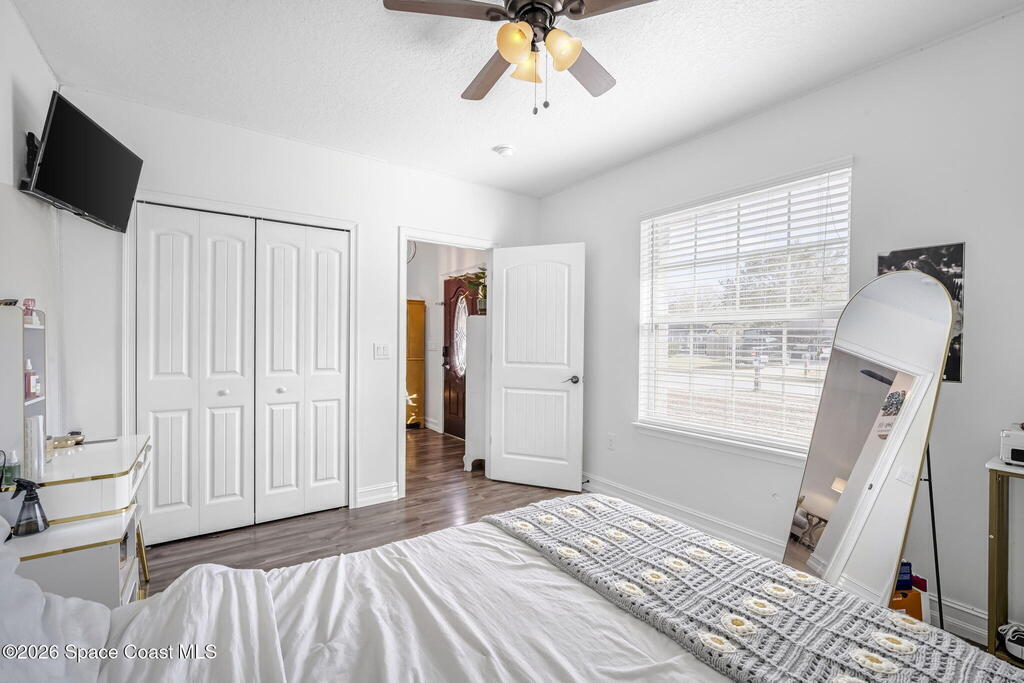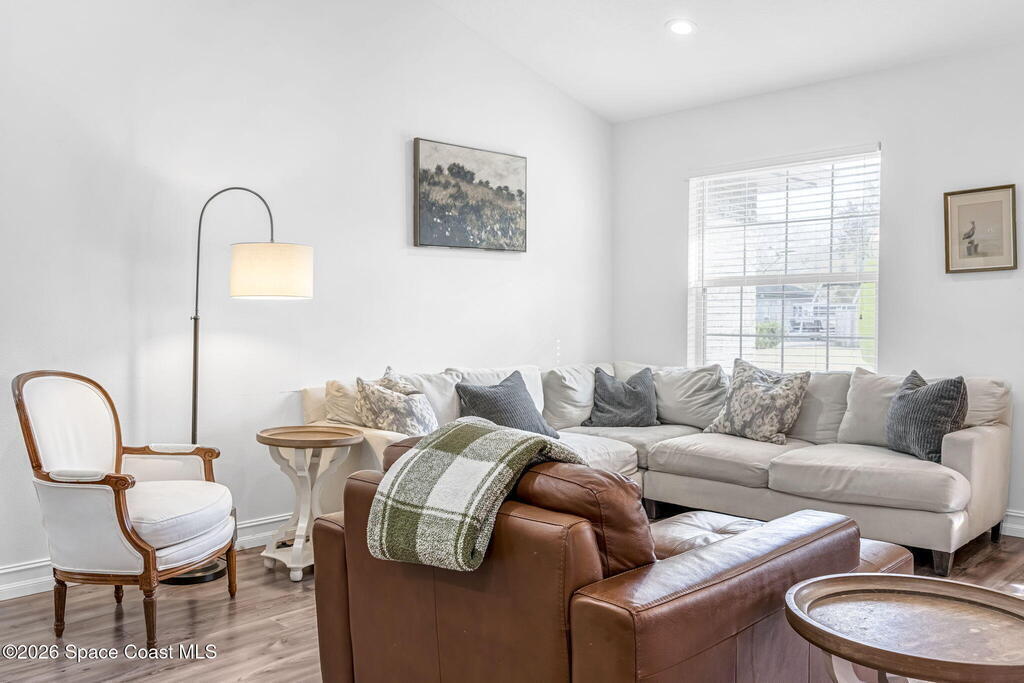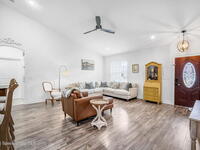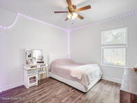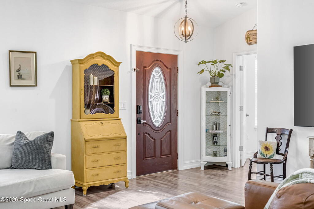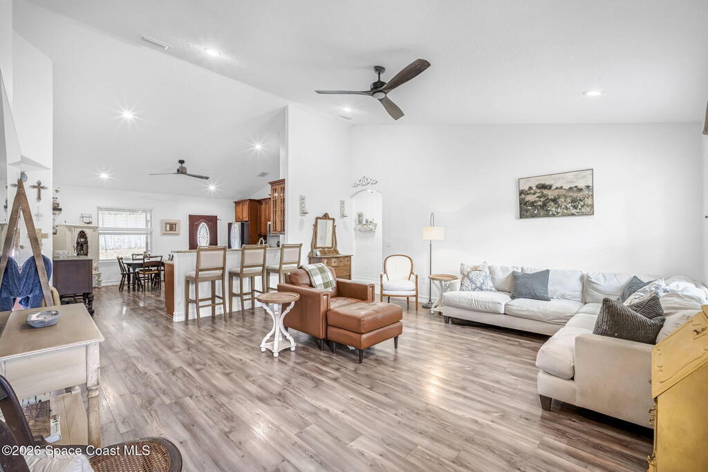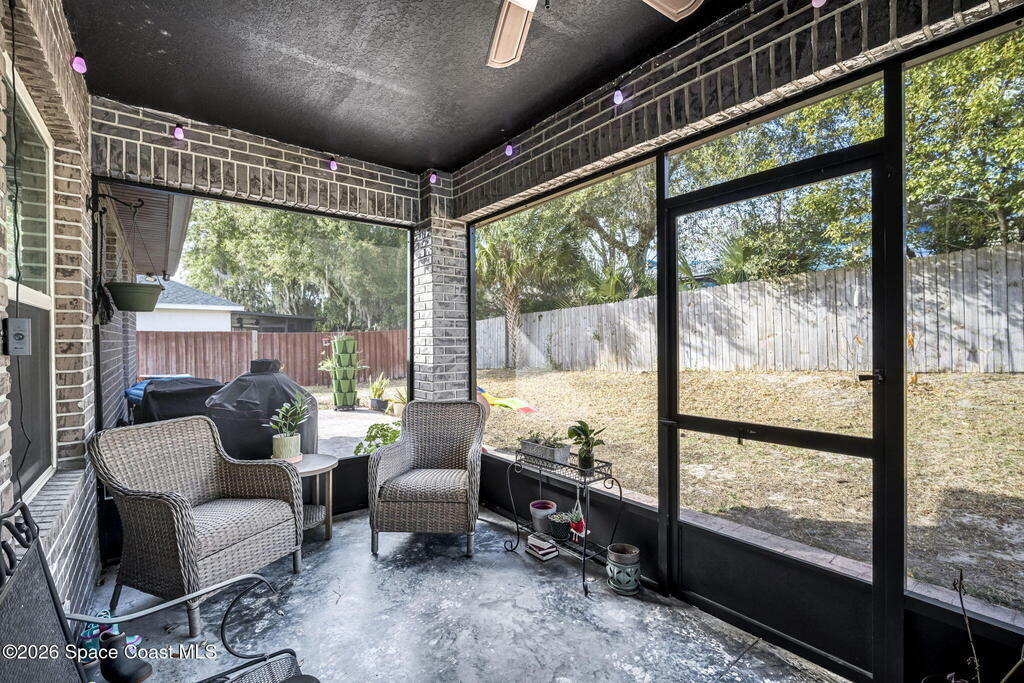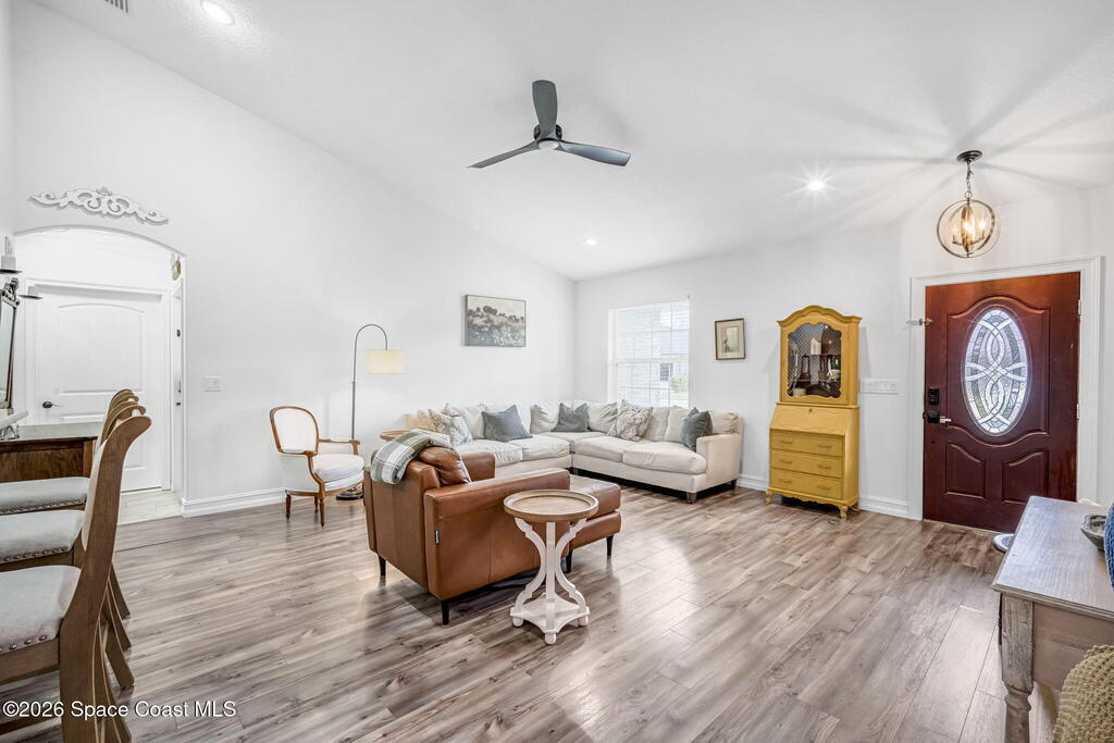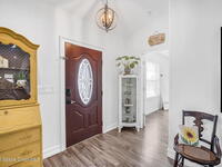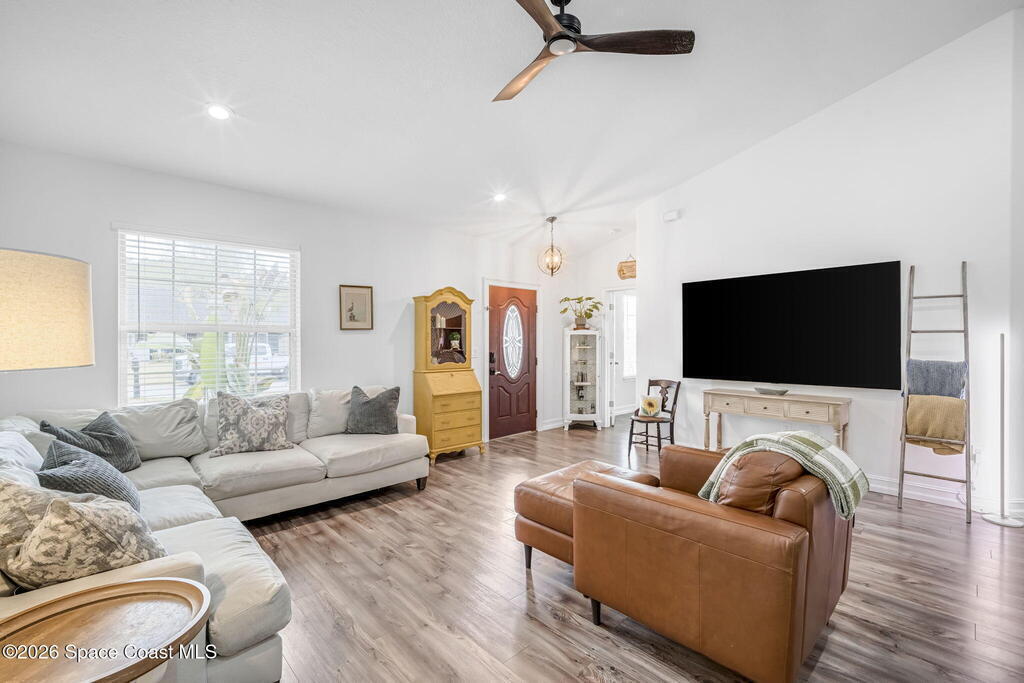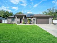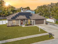 Beautifully maintained brick over block home in peaceful Titusville with no HOA and paid off solar for low electric bills. Built in 2019, this 4BR/2BA/2 car garage home features an open layout, eat n kitchen with stainless steel appliances, granite countertops, soft close cabinetry, large pantry, and breakfast bar. Spacious primary suite offers walk-in closet, jetted tub, separate shower, and dual vanities. Enjoy a screened patio plus extended concrete patio ideal for entertaining, along with an extended driveway for a boat, trailer, or extra vehicles. Additional upgrades include cathedral ceilings, commercial grade laminate and porcelain tile throughout (no carpet), indoor laundry, irrigation, water softener, storm shutters, city water/sewer, and EV-ready garage wiring. Move in ready and energy efficient schedule you're showing today.