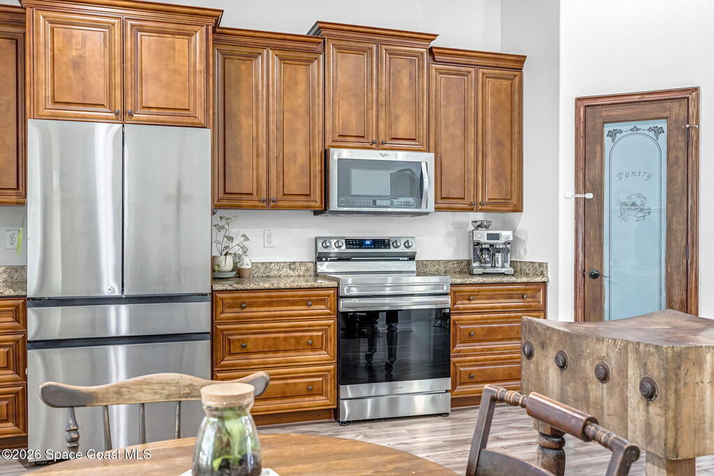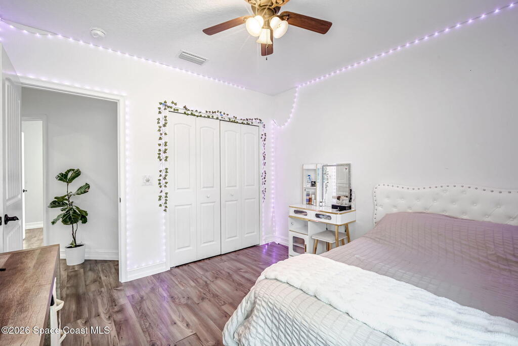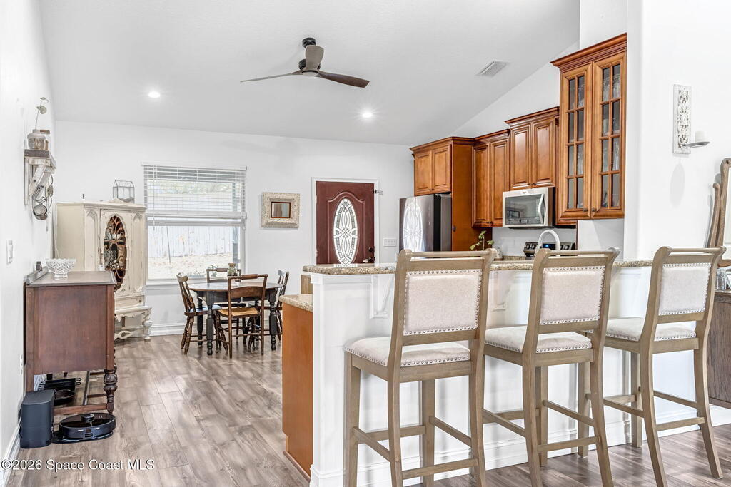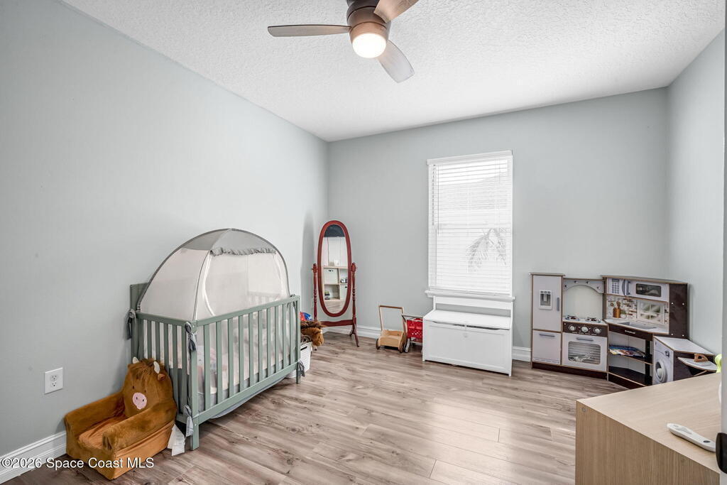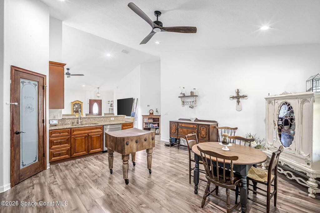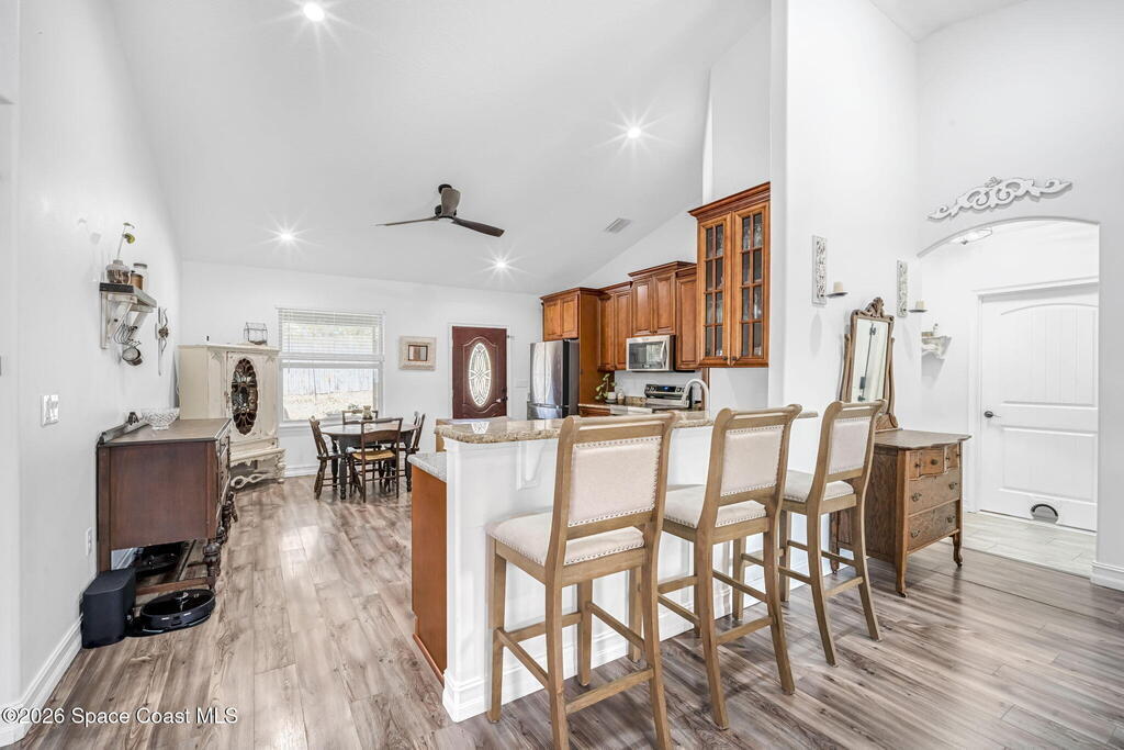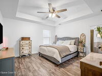 Beautifully maintained brick over block home in peaceful Titusville with no HOA and paid off solar for low electric bills. Built in 2019, this 4BR/2BA/2 car garage home features an open layout, eat n kitchen with stainless steel appliances, granite countertops, soft close cabinetry, large pantry, and breakfast bar. Spacious primary suite offers walk-in closet, jetted tub, separate shower, and dual vanities. Enjoy a screened patio plus extended concrete patio ideal for entertaining, along with an extended driveway for a boat, trailer, or extra vehicles. Additional upgrades include cathedral ceilings, commercial grade laminate and porcelain tile throughout (no carpet), indoor laundry, irrigation, water softener, storm shutters, city water/sewer, and EV-ready garage wiring. Move in ready and energy efficient schedule you're showing today.