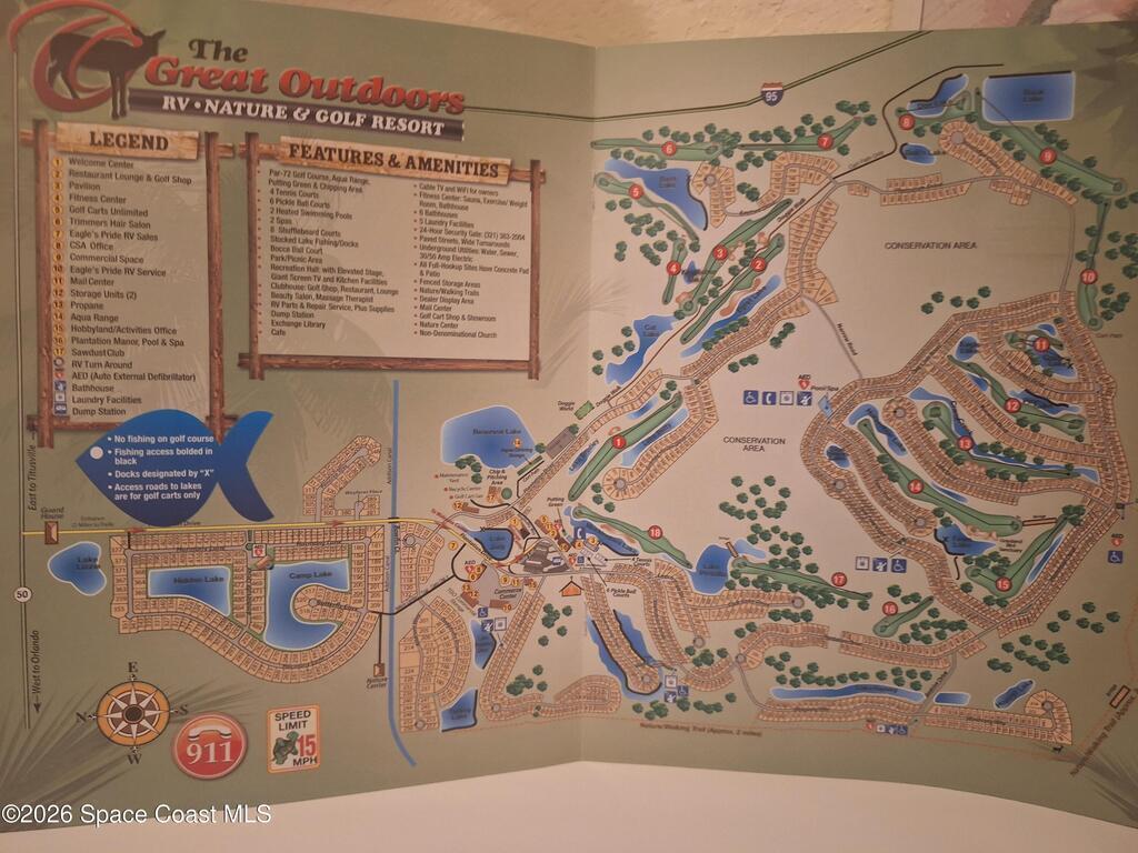 Amazing Opportunity in Exquisite Golf Community. Comes with 18-hole Golf Course, 2 Community Heated Pools, 2 Spas, 4 Tennis Courts, 8 Shuff Board Courts, Bocce Ball Court, Shocked Lake Fishing/Docks, Park/Picnic Area, Fitness Center: Sauna, Exercise/weight room, Bath House. Recreation Hall with Elevated Stage, Giant TV and Kitchen Facilities. A Hall that you can use on special occasion fitting up to 3 to 4 hundred people at each event including Weddings. No water bill along with Free Lawn Maintenance, Cable TV, Wi-Fi for Owners, Restaurant, and a Private Dog park. Nature Trail, Extremely Private and Quite Living with a 24-hour guard gated entrance area. Home has Tremendous Cathedrals Ceiling and many updates including Beautiful Bonus indoor-outdoor Florida room and plus a Large Workshop Room off the Carport with a Special Spot for RV Parking. Close to all Shopping, Schools, Main Roads and the Beach. If you Love the Outdoors, You will Love The Great Outdoors Premier RV & Golf Communit