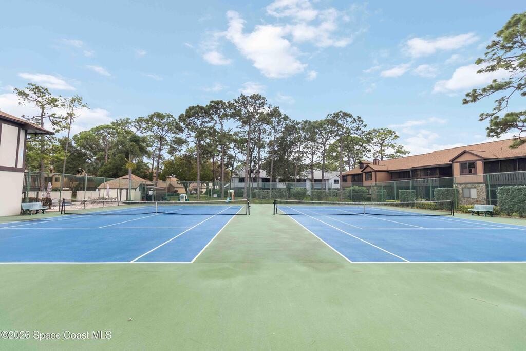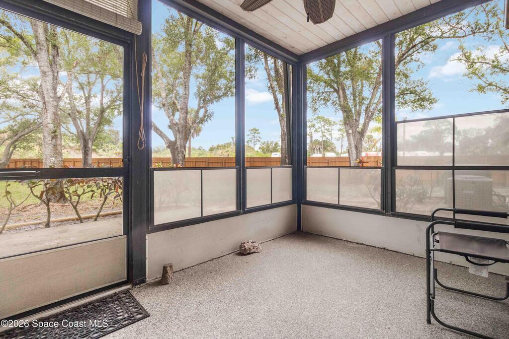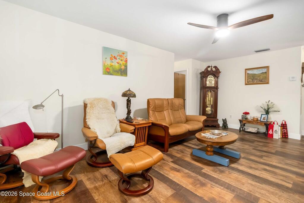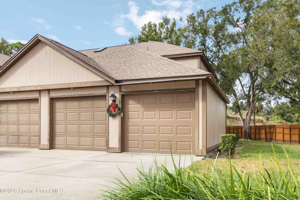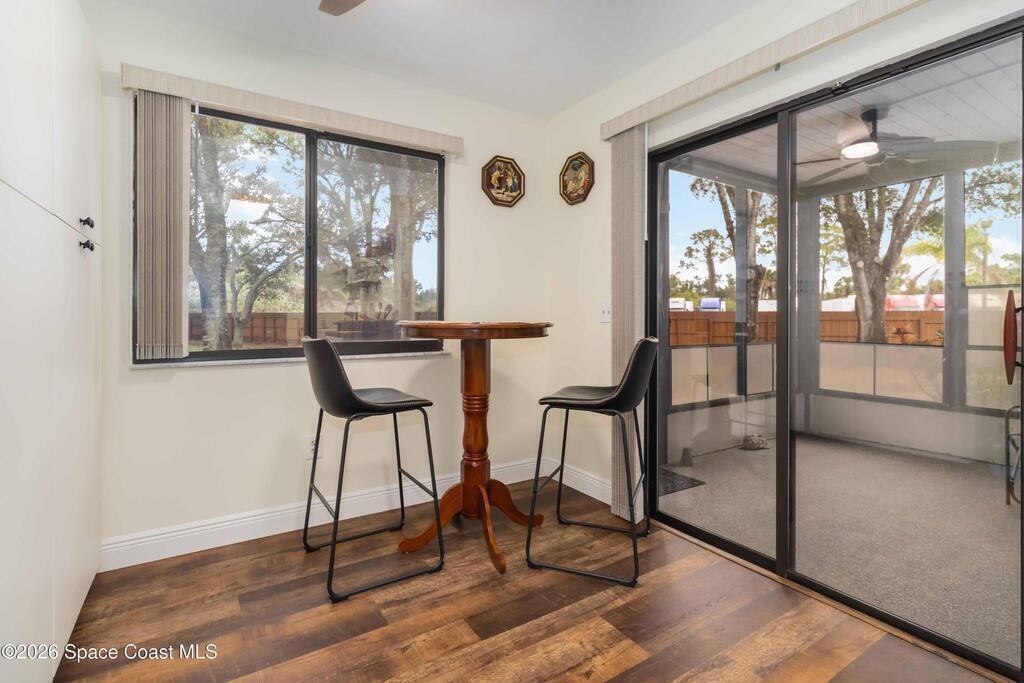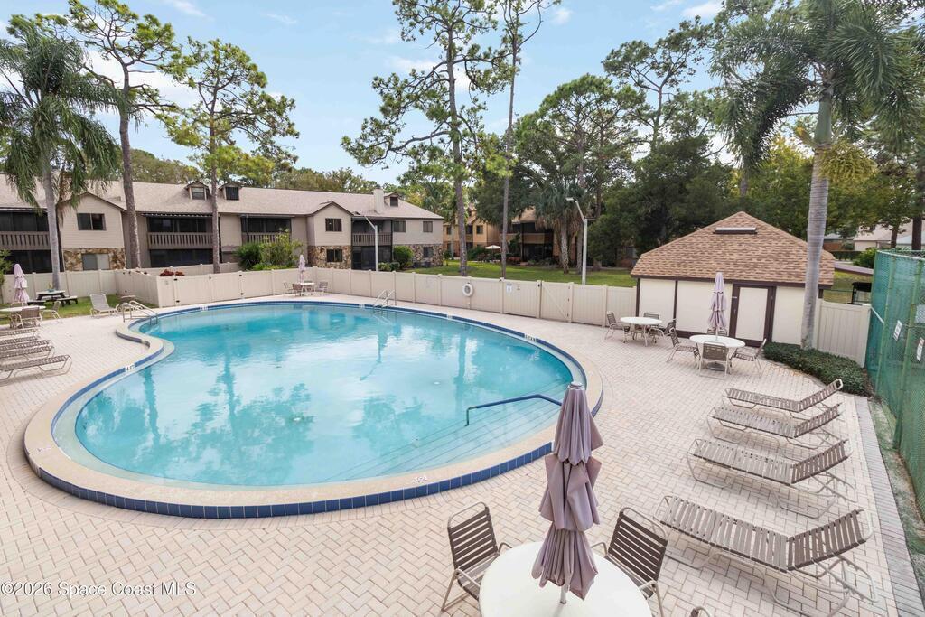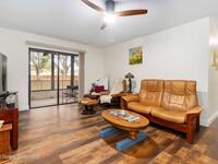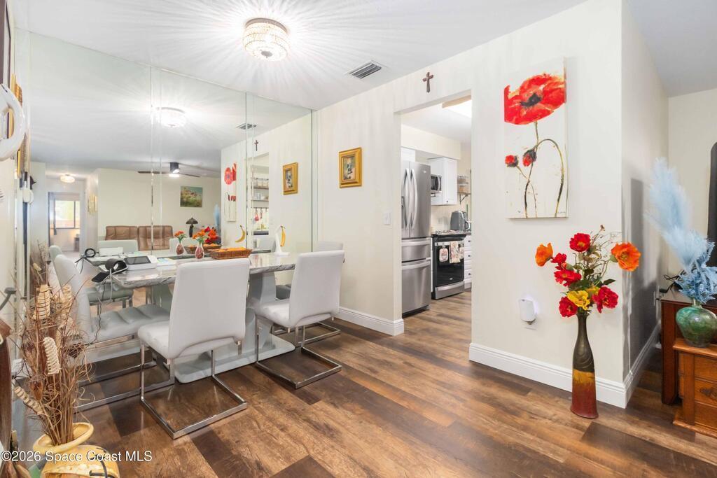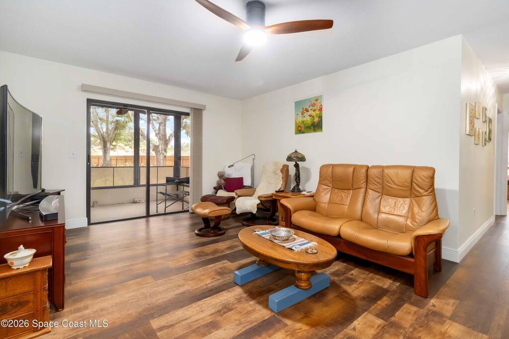 Updated ground floor 2-bedroom, 2-bath condominium with a private 1-car garage in a well-maintained, gated West Melbourne community with on-site management. This open floor plan features wood-look flooring throughout, fresh interior paint, and modernized appliances, including a new garbage disposal. The AC system was replaced in 2023, offering peace of mind and energy efficiency. The kitchen, dining, and living areas flow seamlessly and open to a fully screened lanai, accessible from both the living room and breakfast area through sliding glass doors. The patio floor has been freshly repainted, creating a clean and inviting outdoor retreat. Both bedrooms feature windows and updated fabric blinds. The primary suite offers a walk-in shower, walk-in closet, elevated commodes, and added safety features. A spacious indoor utility closet with washer and dryer adds everyday convenience. Additional highlights include four ceiling fans, updated guest bath fixtures, and thoughtful finishes