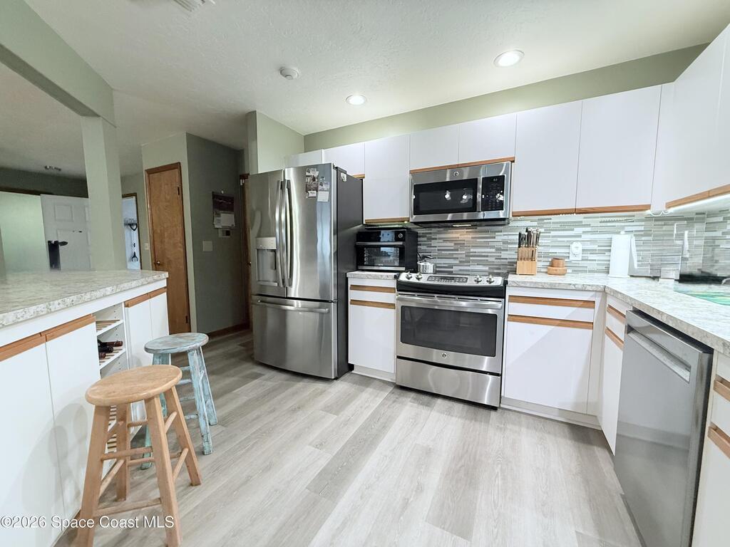 LIGHT, BRIGHT, and beautifully updated ground-floor end unit in the prestigious gated, all-ages community of Greenwood Manor in West Melbourne! Tucked away in a quiet location at the back of the complex, this home offers a peaceful, park-like view from the sunroom and patio. Upgrades include newer impact windows, power shades, stainless steel appliances and fixtures, laminate flooring and a relaxing jetted tub. The interior is recently painted. Enjoy the convenience of a private one-car garage plus a spacious storage room. Community amenities feature a heated pool, clubhouse with library, fitness center, billiards room, and meeting/card room. Ideally located with quick access to I-95, major shopping, Northrop Grumman, L3Harris, Melbourne-Orlando International Airport, hospitals, the Intracoastal Waterway, and nearby beaches. The condo fee covers exterior maintenance, cable TV, DVR, internet, pest control, and more.